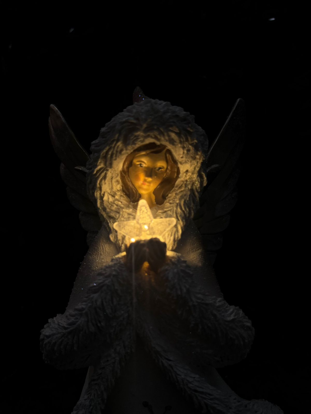 Elegante ángel elaborado en poliresina con delicados acabados, vestido en tonos claros con detalles festivos en relieve. Con una altura de 32 cm, incorpora luz en su interior que realza su serenidad y belleza, creando un ambiente cálido y espiritual en tu decoración navideña.