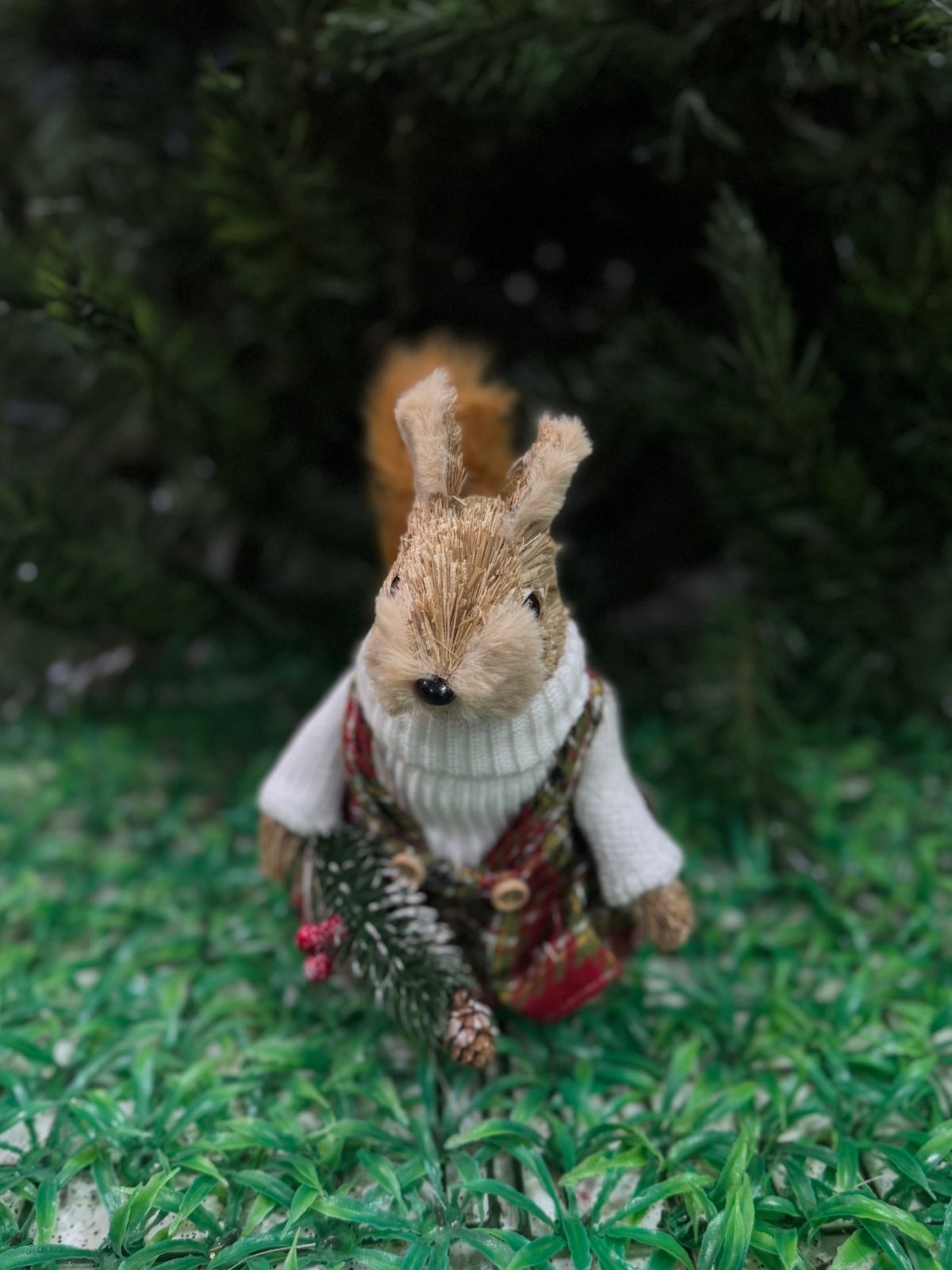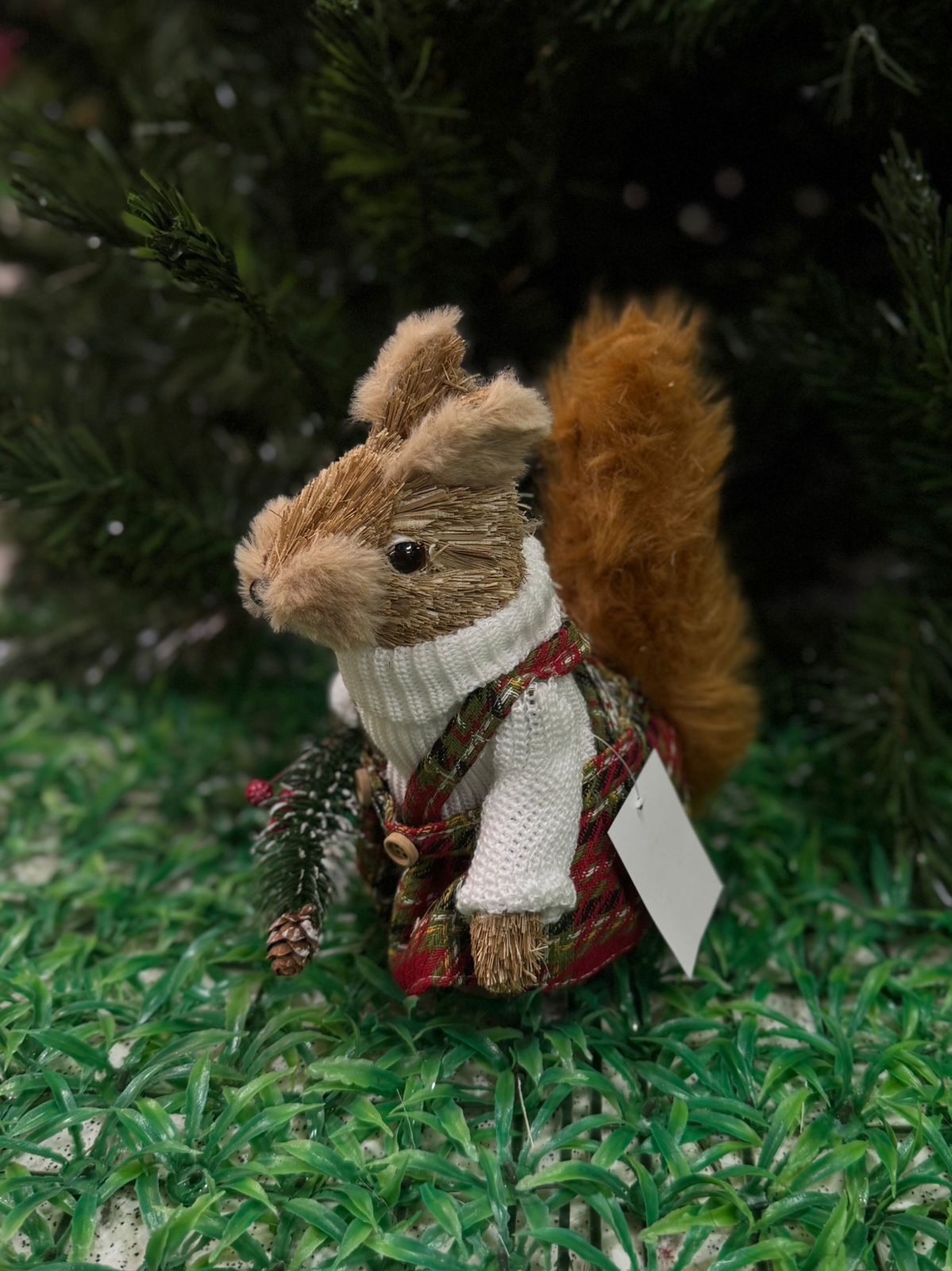 Encantadora y elegante, esta ardilla decorativa de 22 cm está vestida con un encantador conjunto de estilo escocés, combinando cuadros tradicionales en rojo y verde con un suéter tejido blanco que resalta su aire acogedor. Su suave y esponjosa cola, junto con sus detalles artesanales como el ramito con piña y botones de madera, le dan un aspecto cálido y entrañable. Perfecta para ambientar espacios navideños o rincones invernales con un toque de ternura y estilo rústico.