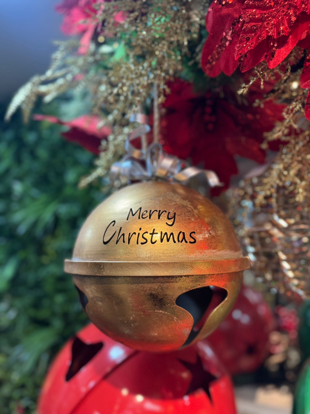 Cascabel Metalizado Dorado Merry Christmas 26 x 26. Fabricado en metal con acabado dorado envejecido y detalle de la frase “Merry Christmas” , resalta con un lazo decorativo plateado en la parte superior. Su diseño elegante y festivo aporta un toque tradicional y luminoso al árbol o a cualquier rincón navideño.