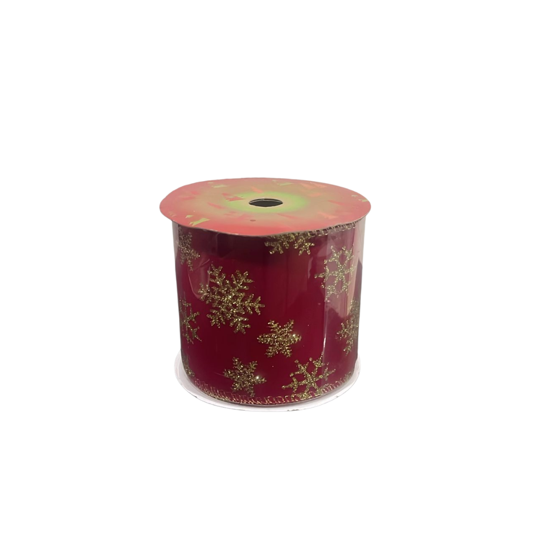 Cinta rojac con borde dorado y copos de nieve dorados 10cm x 10yd
