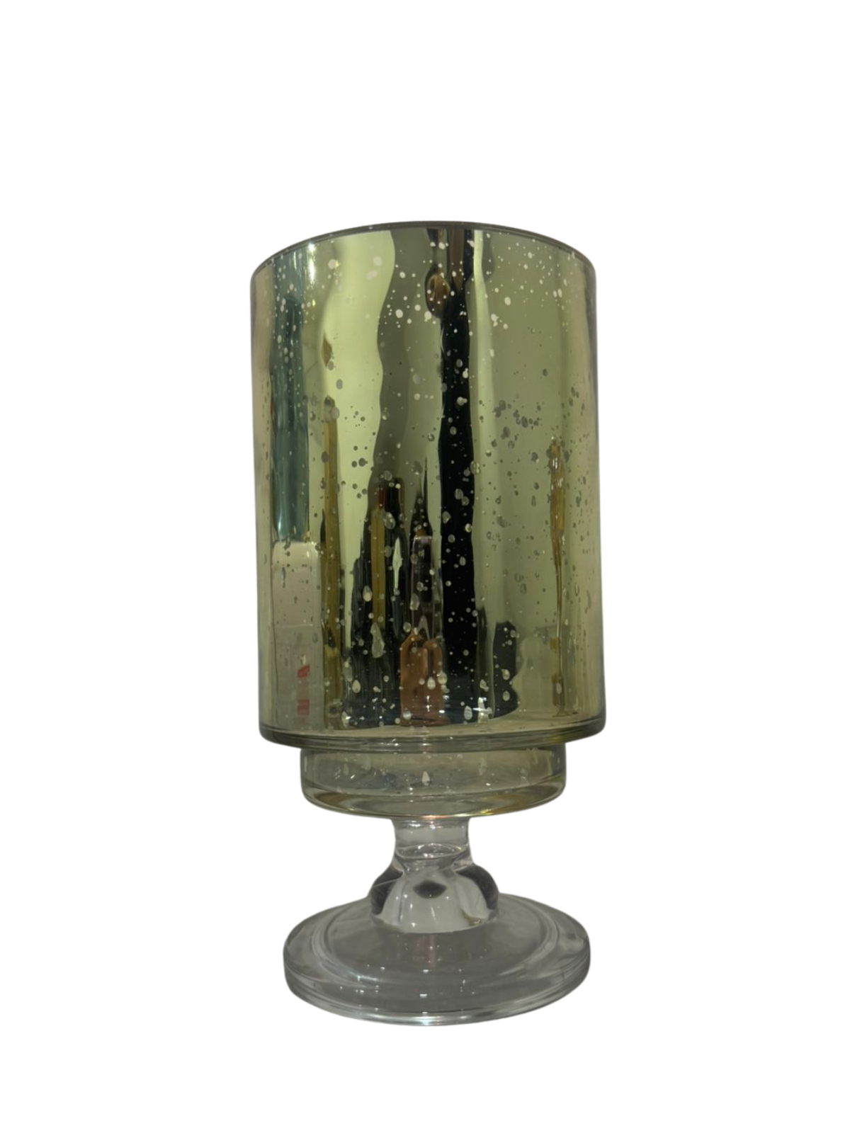 La Copa Envejecida es un elegante accesorio decorativo de vidrio con acabado efecto mercurio que aporta un encanto vintage y sofisticado a cualquier espacio. Su diseño alto y estilizado, con base de pedestal transparente y cálido tono envejecido, la convierte en una pieza versátil para usar como portavelas, florero o centro de mesa, ideal para realzar la decoración de salas, comedores, eventos o celebraciones especiales. Medidas: 13cm x 13cm x 26 cm