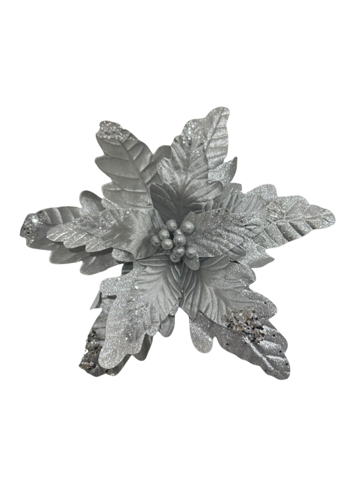Flor decorativa en gamuza de alta calidad, color plateado con acabado escarchado brillante. Ideal para decorar árboles, centros de mesa y arreglos navideños elegantes.