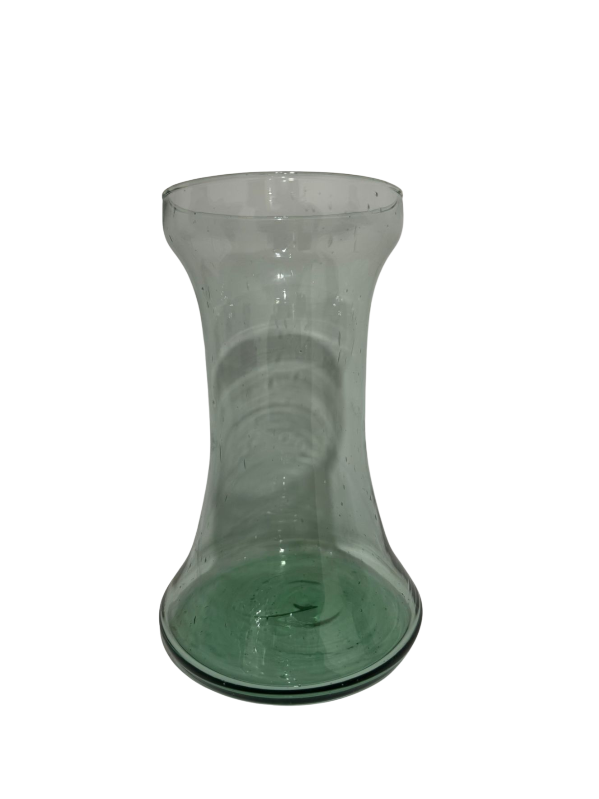 Jarrón de vidrio transparente de forma estilizada. Medidas: alto 22 cm, ancho de la boca 12 cm y ancho máximo 46 cm. Ideal para arreglos florales o como pieza decorativa que aporta un toque fresco y elegante a cualquier ambiente.
