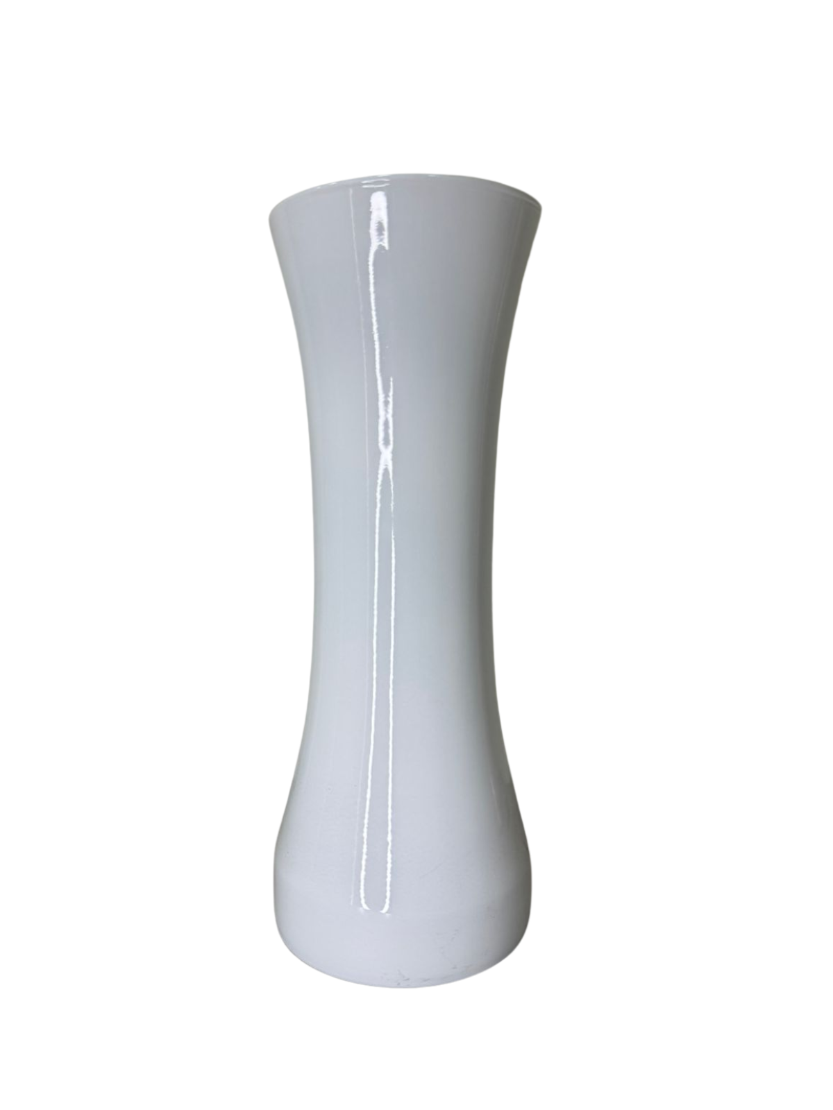 Jarrón decorativo en tono blanco con diseño estilizado, ideal para centros de mesa o arreglos florales. Medidas: alto 31 cm, diámetro de la boca 11 cm, ancho máximo 38 cm.