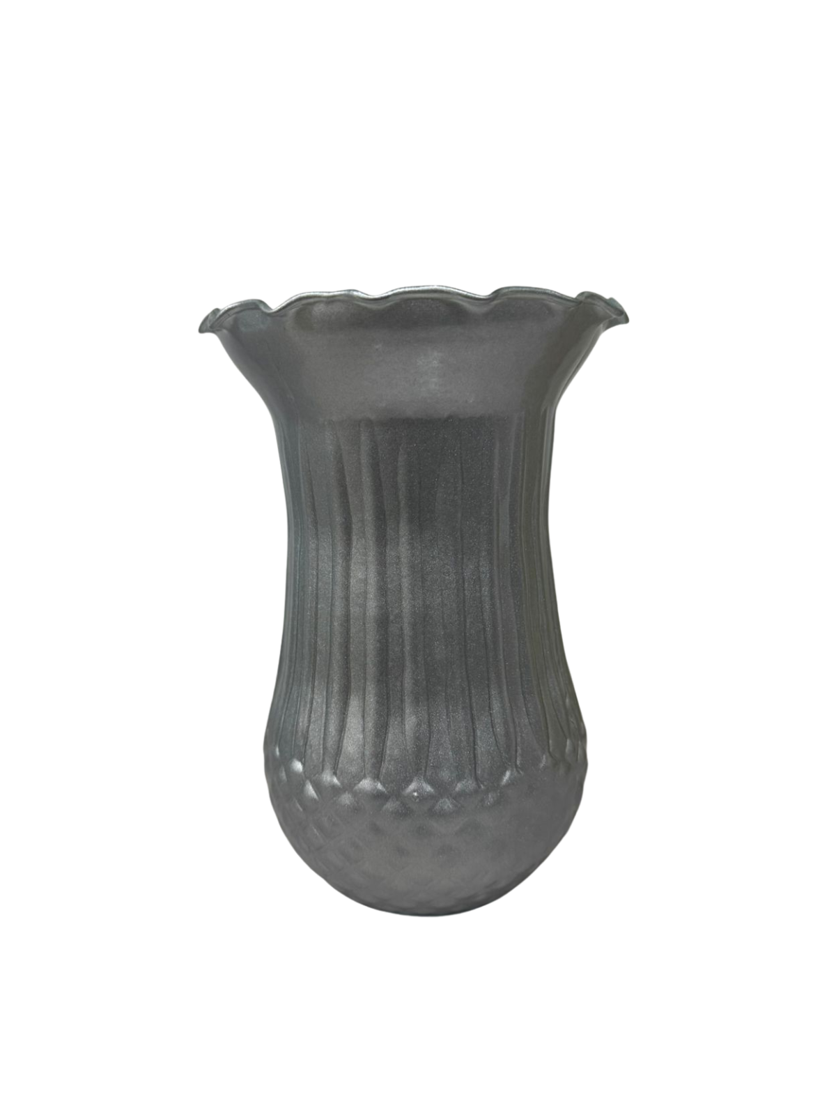 Florero de vidrio color plateado con relieve de punta de diamante y borde ondulado. Su diseño elegante y llamativo lo convierte en una pieza decorativa ideal para centros de mesa o arreglos florales. Medidas: 24 cm de alto y 46 cm de ancho en la base.