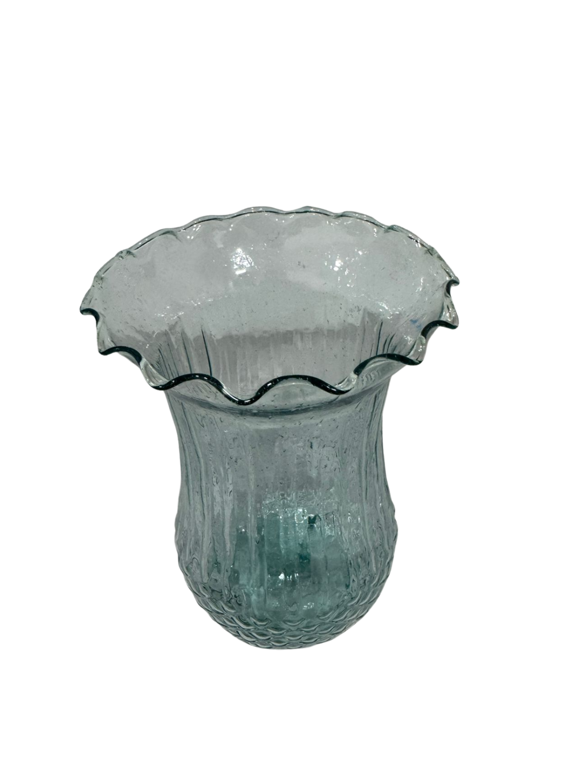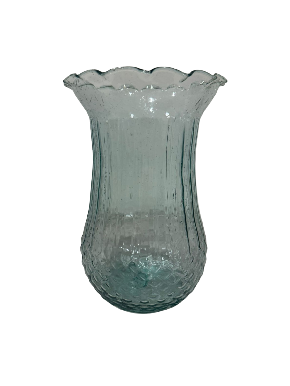Florero de vidrio transparente con relieve en forma de punta de diamante y borde ondulado. Su diseño clásico y texturizado añade un toque elegante y distintivo a cualquier ambiente, ideal para arreglos florales o como pieza decorativa. Medidas: 24 cm de altura y 46 cm de ancho en la base.