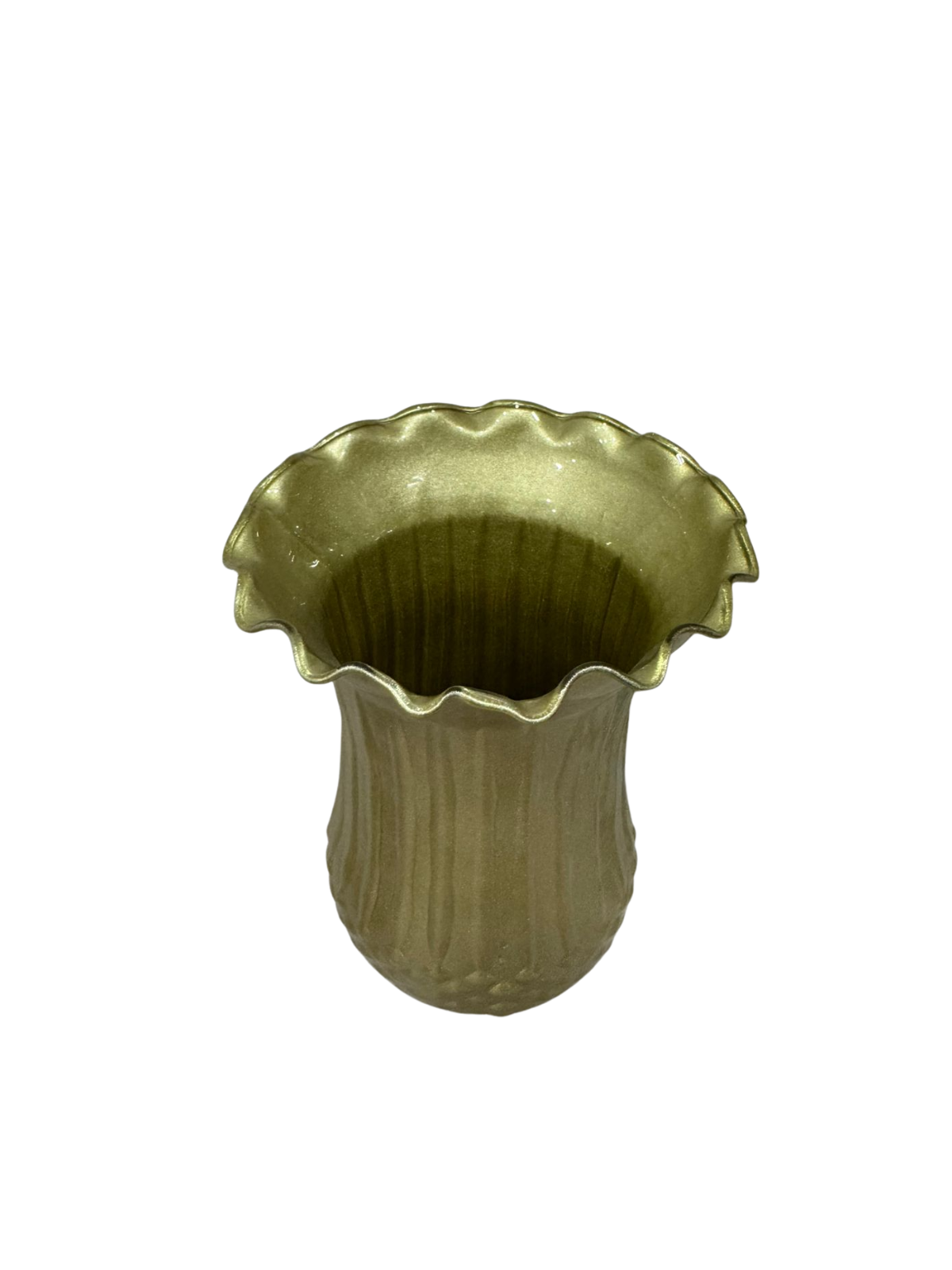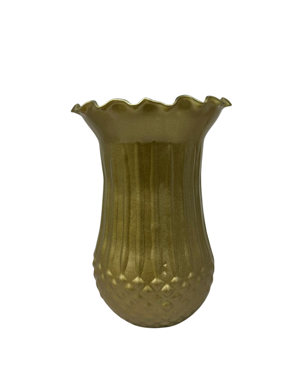 Florero de vidrio color dorado con relieve en forma de punta de diamante y borde ondulado. Su diseño clásico y texturizado añade un toque elegante y sofisticado a cualquier ambiente, ideal para arreglos florales o como pieza decorativa. Medidas: 24 cm de altura y 46 cm de ancho en la base.
