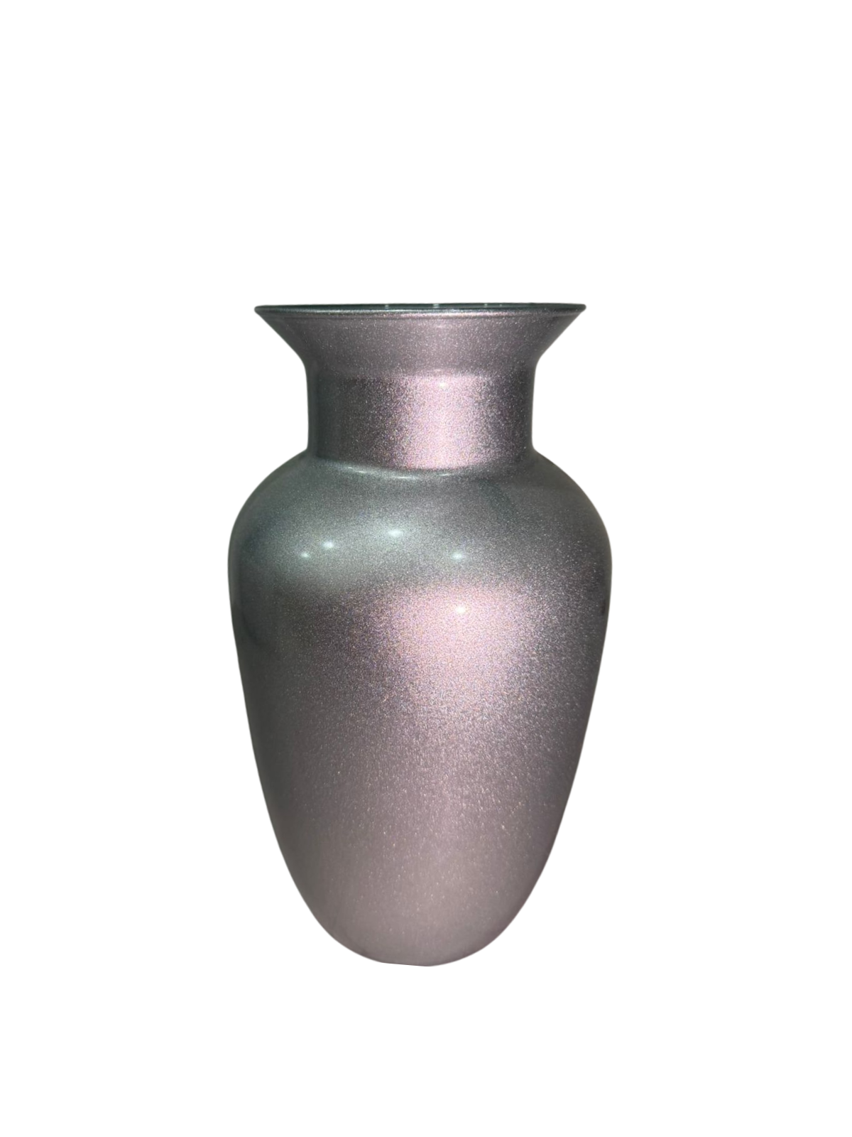 Jarrón de vidrio con elegante acabado plateado y diseño clásico de boca ancha. Su brillo metálico lo convierte en una pieza decorativa sofisticada, ideal para arreglos florales o como centro de mesa. Medidas: 26 cm de alto x 47 cm de ancho en la parte más amplia.