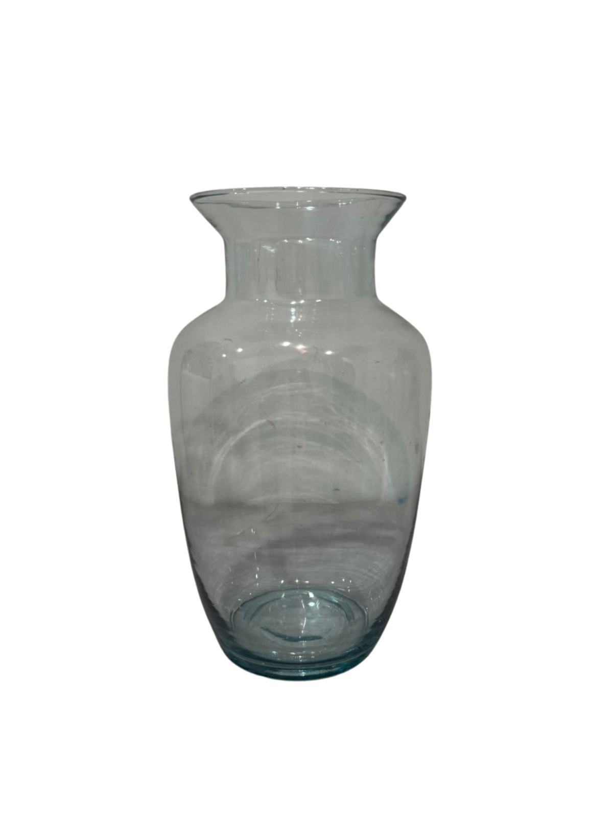 Jarrón de vidrio transparente con diseño clásico de boca ancha y cuerpo curvo. Su estilo versátil lo hace perfecto para arreglos florales o como pieza decorativa en distintos ambientes. Medidas: 26 cm de alto x 48 cm de ancho en la parte más amplia.