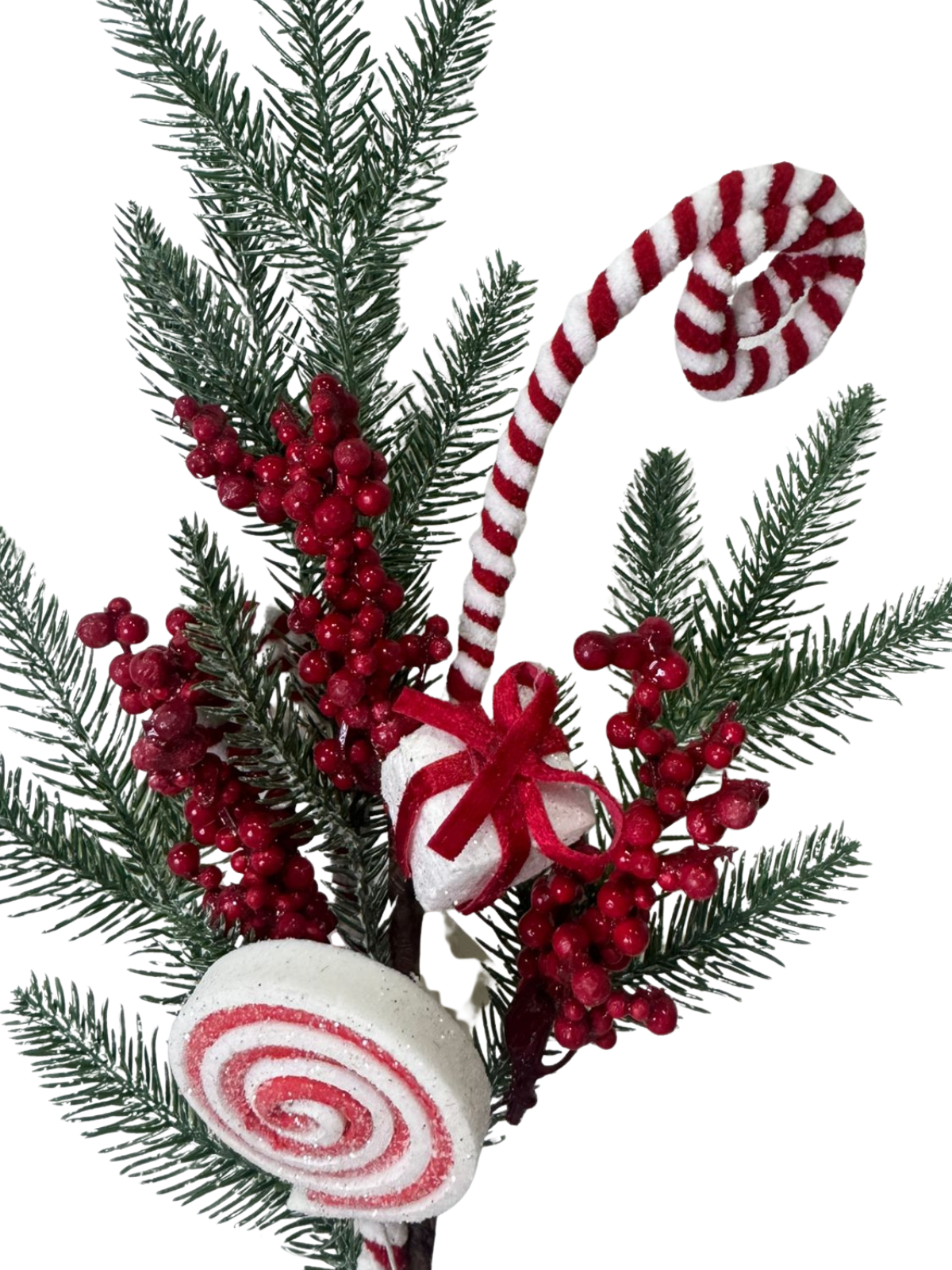 Follaje decorativo tipo espiga con berries y detalles de regalo de 70 cm. Su diseño festivo y acabado brillante aportan un toque alegre y elegante a arreglos navideños, centros de mesa o decoraciones del hogar. Ideal para realzar tus espacios con un estilo cálido y lleno de espíritu navideño