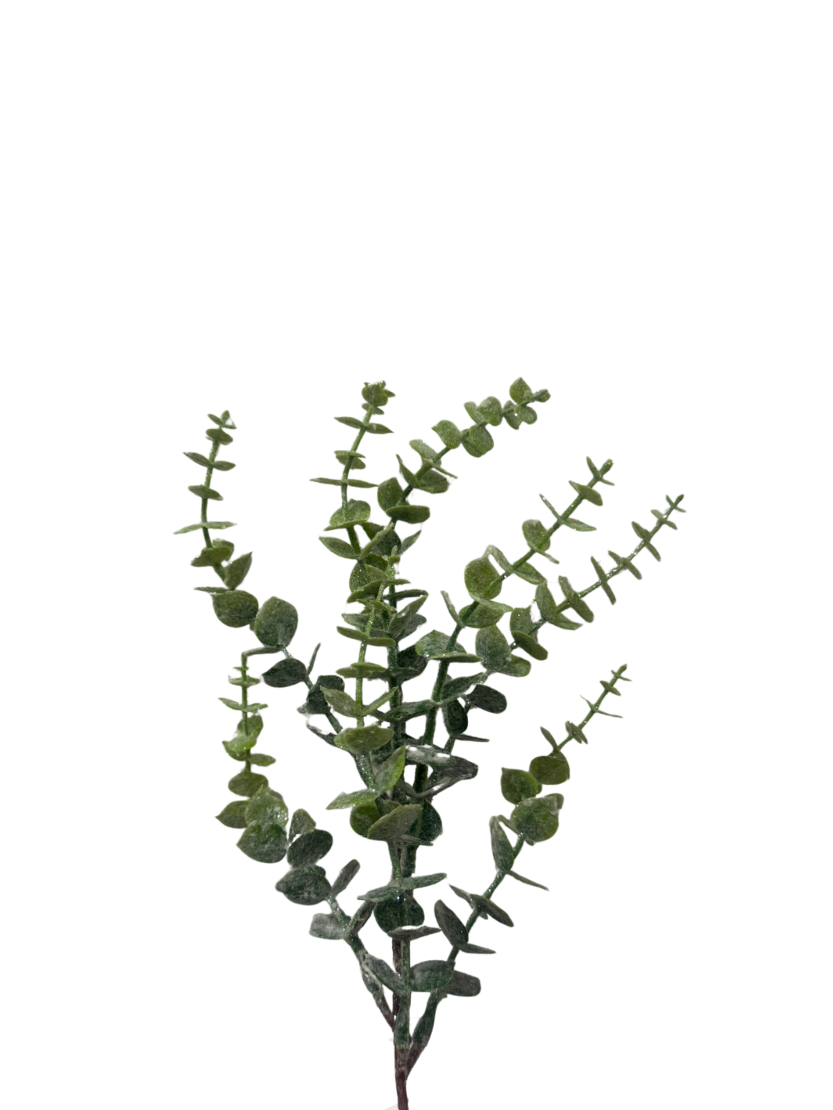 Delicado follaje decorativo con hojas de eucalipto cubiertas con un sutil toque escarchado blanco. Ideal para arreglos navideños, centros de mesa o decoraciones invernales, aportando un efecto nevado elegante y natural.
