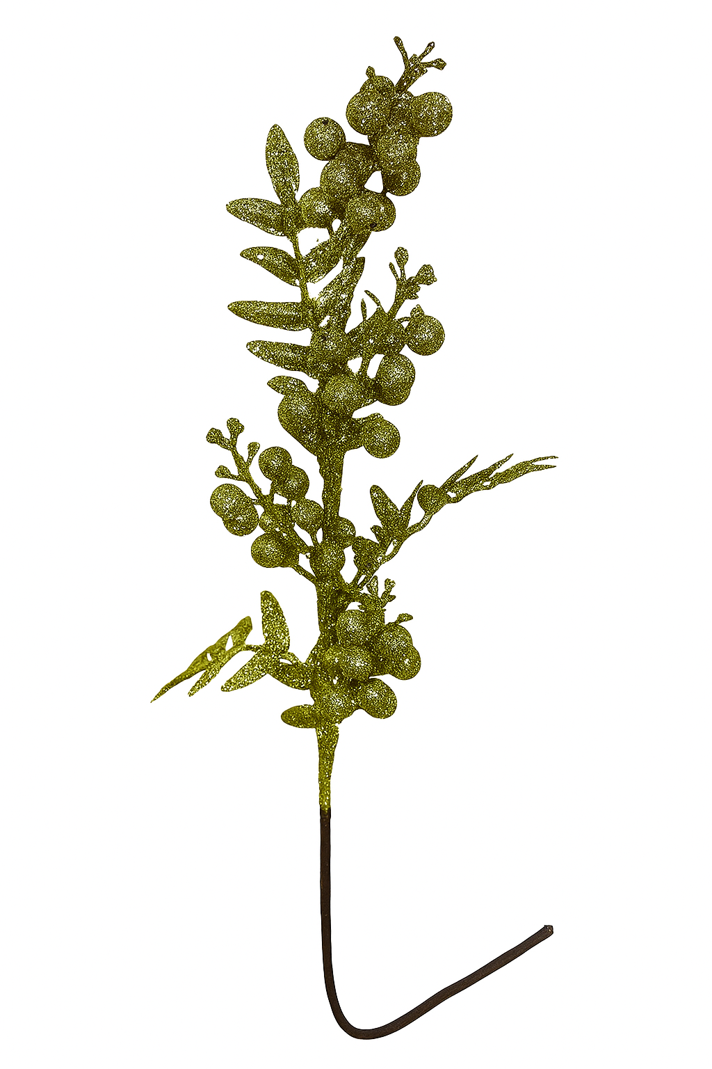 Follaje decorativo con hojas, flores y esferas en acabado escarchado dorado. Su diseño elegante y brillante aporta un toque festivo y sofisticado a arreglos navideños, centros de mesa o decoraciones florales.
