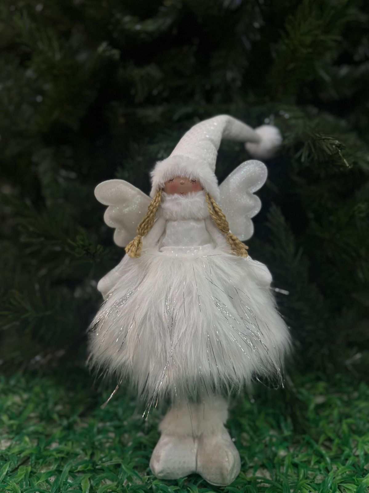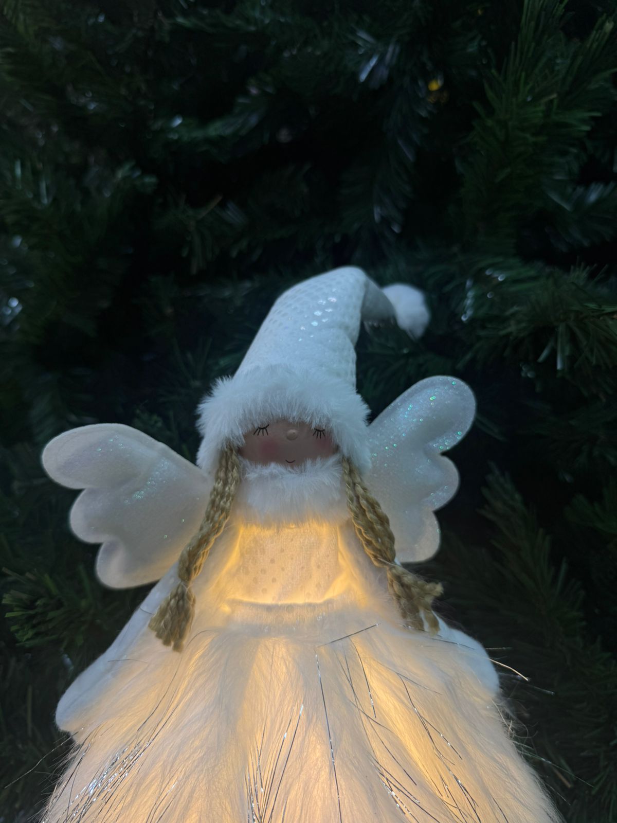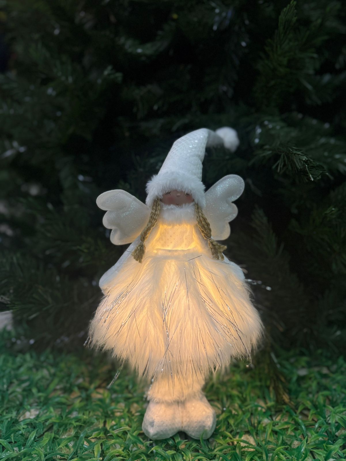 Aporta un toque mágico y encantador a tu decoración navideña con esta delicada Hada Sentada de alas blancas, diseñada con finos detalles brillantes y una textura suave que transmite ternura y fantasía. Luce un gorro blanco terminado en punta tipo copo y una falda esponjosa con destellos plateados que alumbra en la parte inferior, creando un efecto luminoso cálido y acogedor. Con medidas de 22×16×50cm, es ideal para colocar en el árbol, estanterías o rincones especiales, llenando tu hogar de luz y espíritu navideño.