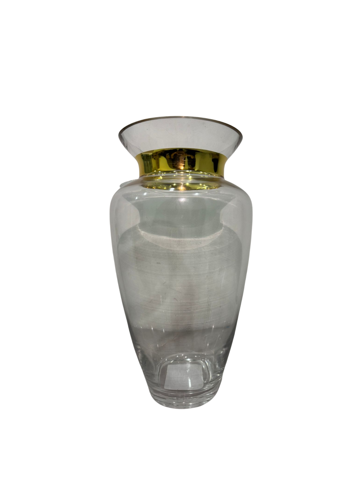Jarrón de cristal transparente con diseño tipo cántaro y borde superior adornado con elegante detalle dorado, ideal para aportar un toque sofisticado a cualquier espacio. Medidas: 13 × 13 × 25,5 cm.