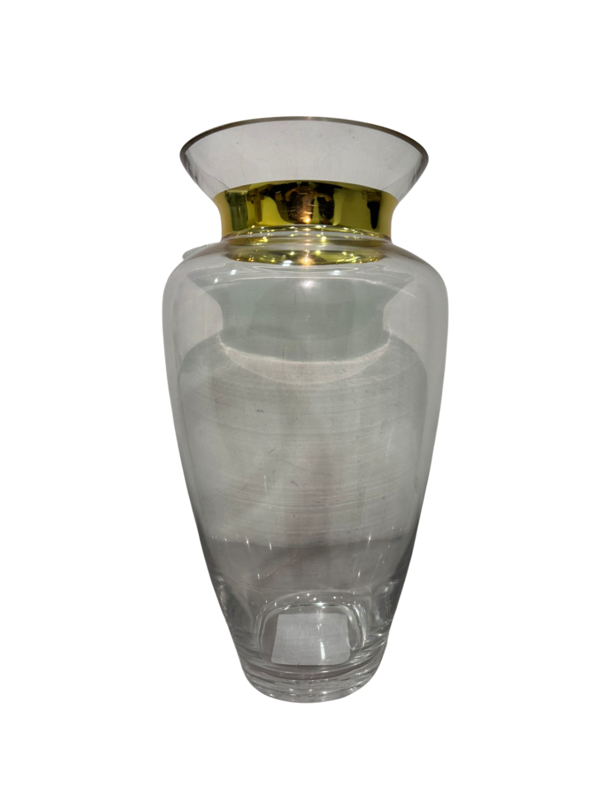 Jarrón de cristal transparente con diseño tipo cántaro y borde superior adornado con elegante detalle dorado, ideal para aportar un toque sofisticado a cualquier espacio.