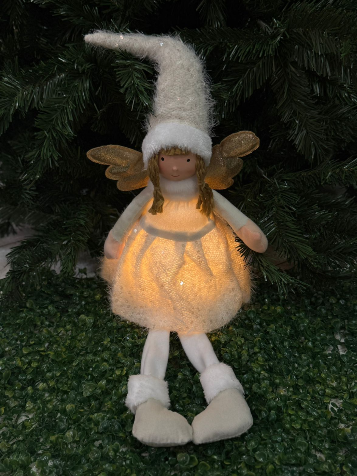 Encantadora muñeca navideña con falda iluminada que brinda un efecto cálido y acogedor. Su diseño combina detalles suaves y brillantes, con alas decorativas, gorro puntiagudo y acabado en tonos claros que evocan ternura y elegancia. Perfecta para ambientar espacios festivos con un toque de luz y fantasía.