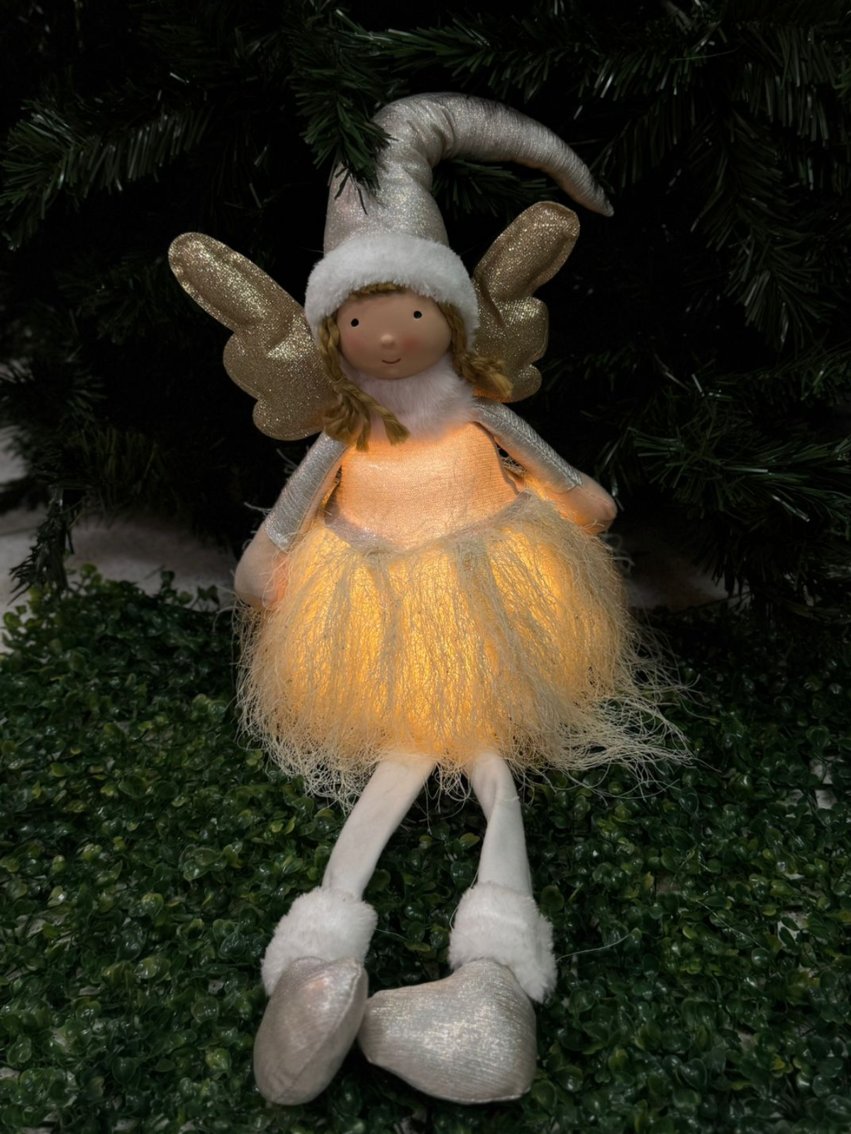 Hermosa muñeca decorativa con vestido tipo tutú iluminado con luces LED que aportan un brillo mágico. Su diseño angelical, con alas suaves, gorro puntiagudo y delicados detalles brillantes, la convierte en una pieza perfecta para resaltar cualquier rincón navideño con encanto y luminosidad.