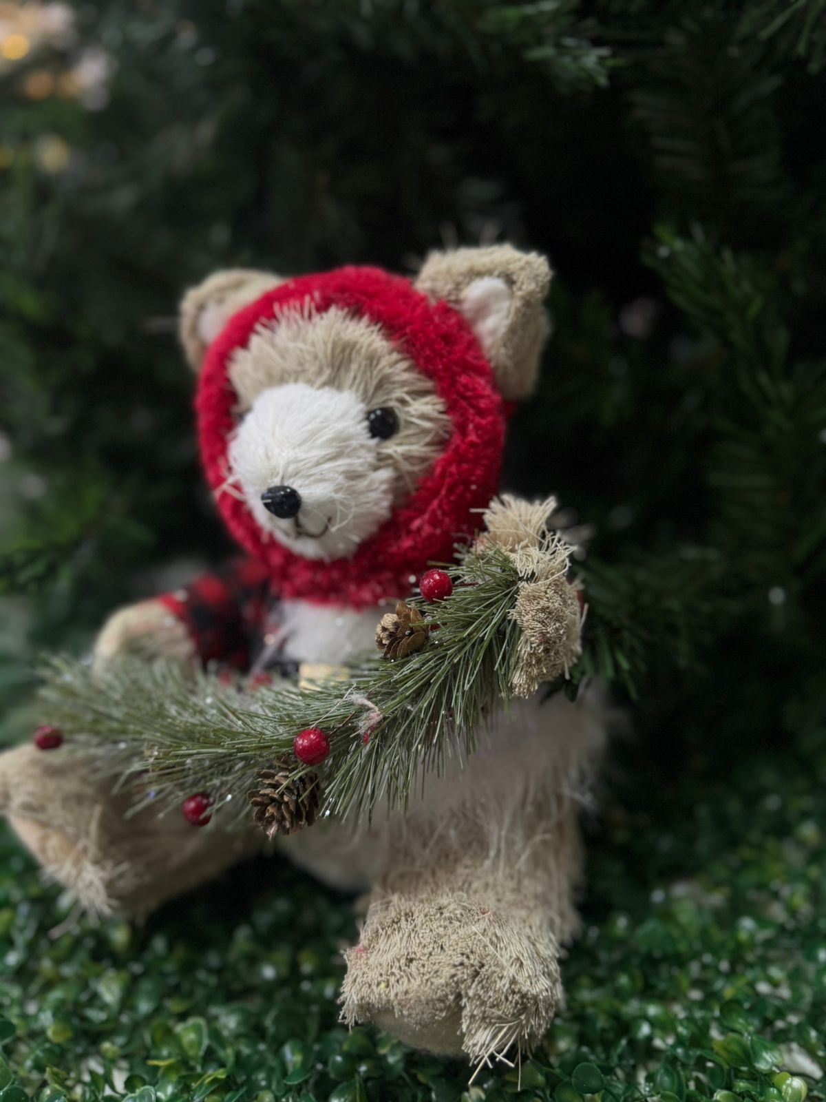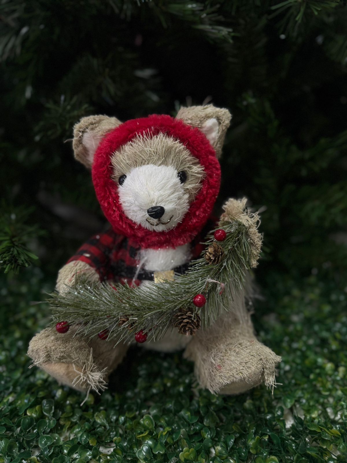 Este tierno oso decorativo de 21 cm de alto luce un encantador atuendo escocés en tonos rojos y negros, acompañado de un suéter tejido y botones que realzan su estilo festivo. Sentado con una expresión amigable, sostiene una ramita decorada con piñas y frutos rojos, mientras su gorrito rojo con pompón añade un toque acogedor. Ideal para dar calidez y un aire navideño a tus espacios durante la temporada.