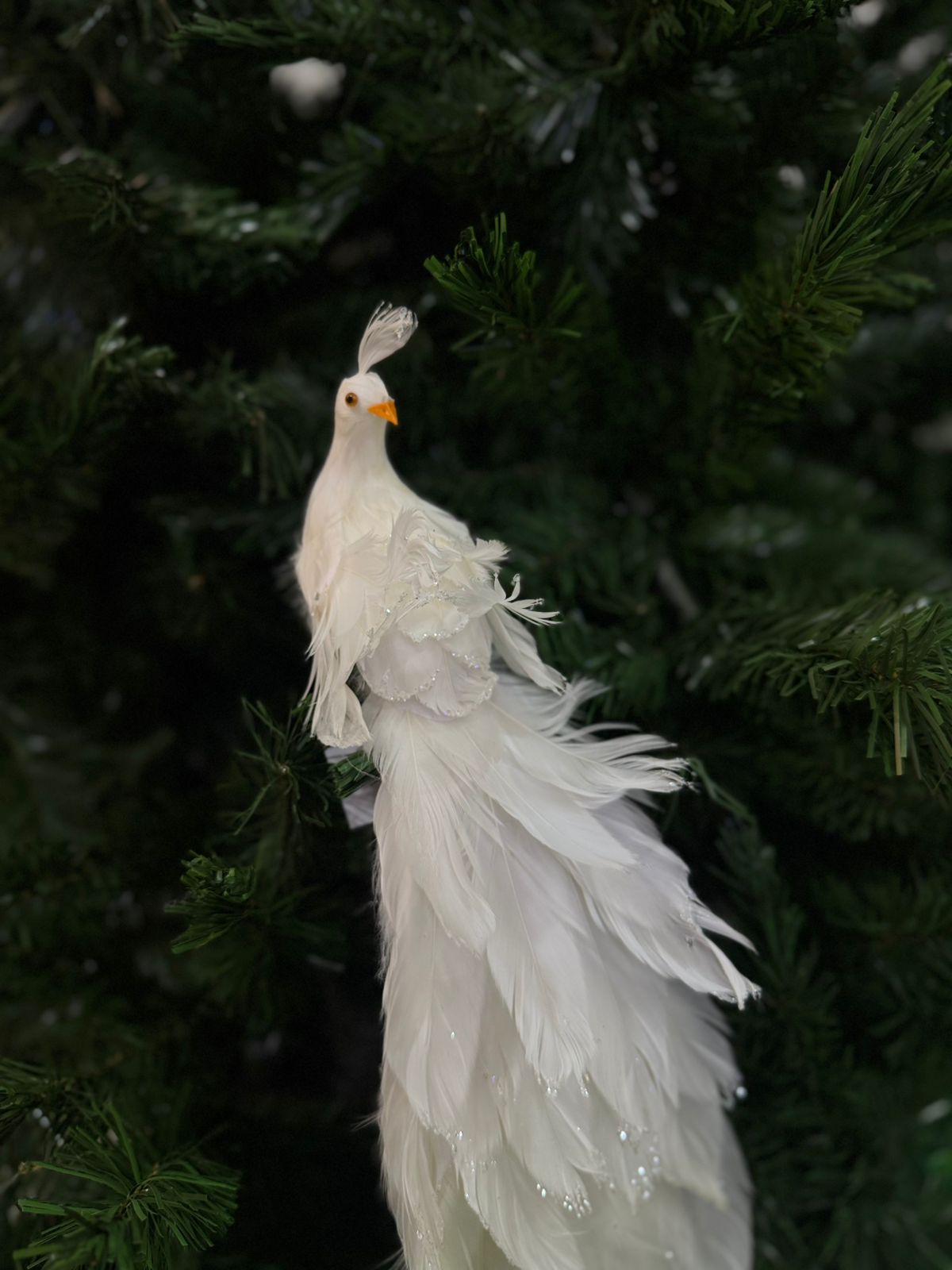 Aporta un aire elegante y sofisticado a tu decoración navideña con este majestuoso Pavo Real Blanco, confeccionado con delicadas plumas que caen en una larga y vistosa cola adornada con sutiles brillos que reflejan la luz, realzando su porte distinguido y encantador; con unas medidas de 40×15×13 cm, es la pieza ideal para embellecer el árbol, centros decorativos o rincones especiales con un toque refinado y festivo.
