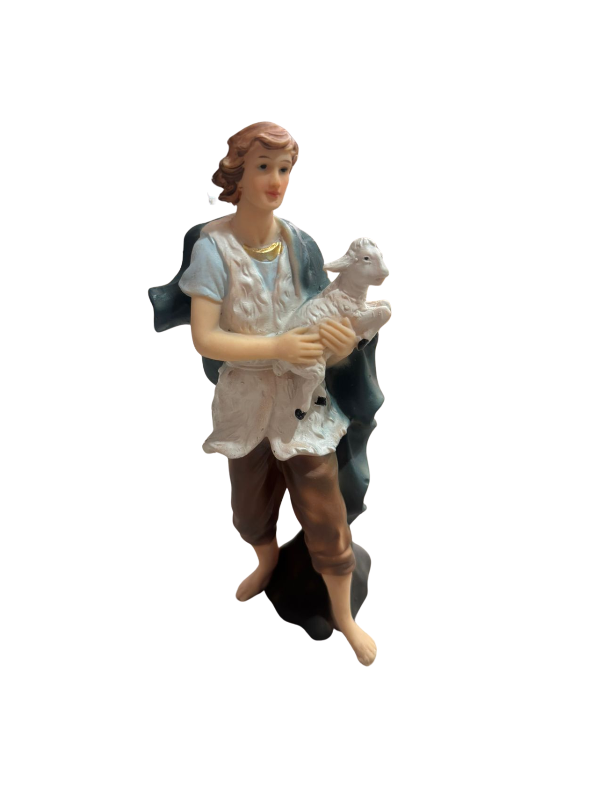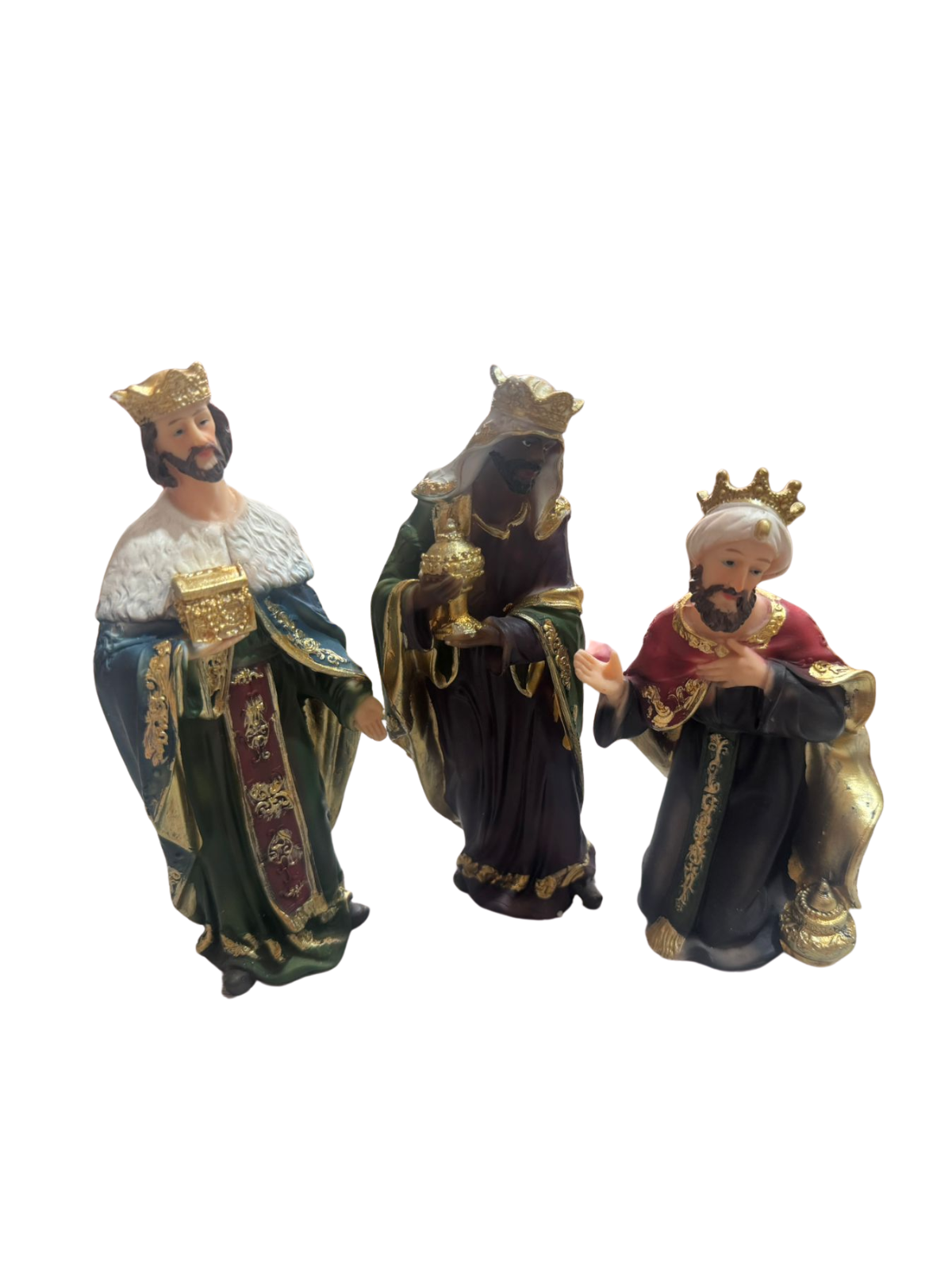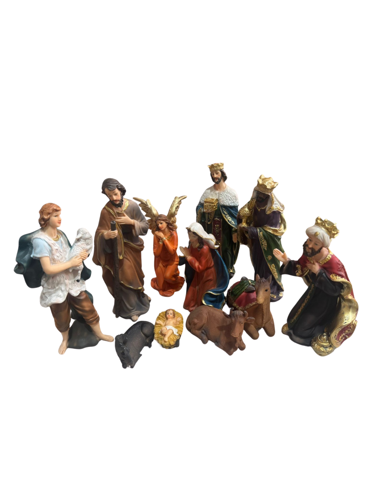 Hermoso Pesebre de 11 piezas elaborado en poliresina, con figuras de 21 cm de altura aproximadamente. Cada pieza está finamente detallada y pintada a mano, reflejando la ternura y el significado espiritual del nacimiento de Jesús.