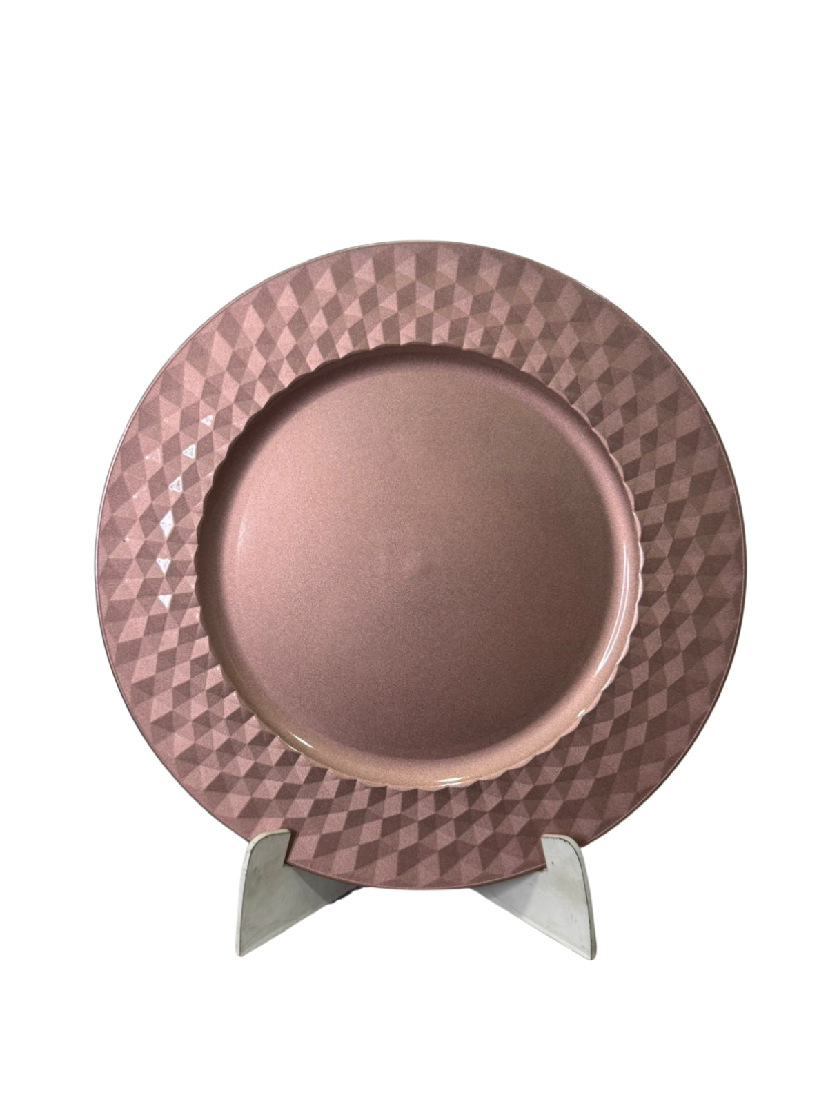 Dale un toque de sofisticación a tu mesa con este elegante plato base de 33 cm en acabado oro rosa metálico. Su borde ancho cuenta con un diseño geométrico en relieve que refleja la luz y añade un detalle moderno y refinado a cualquier montaje.