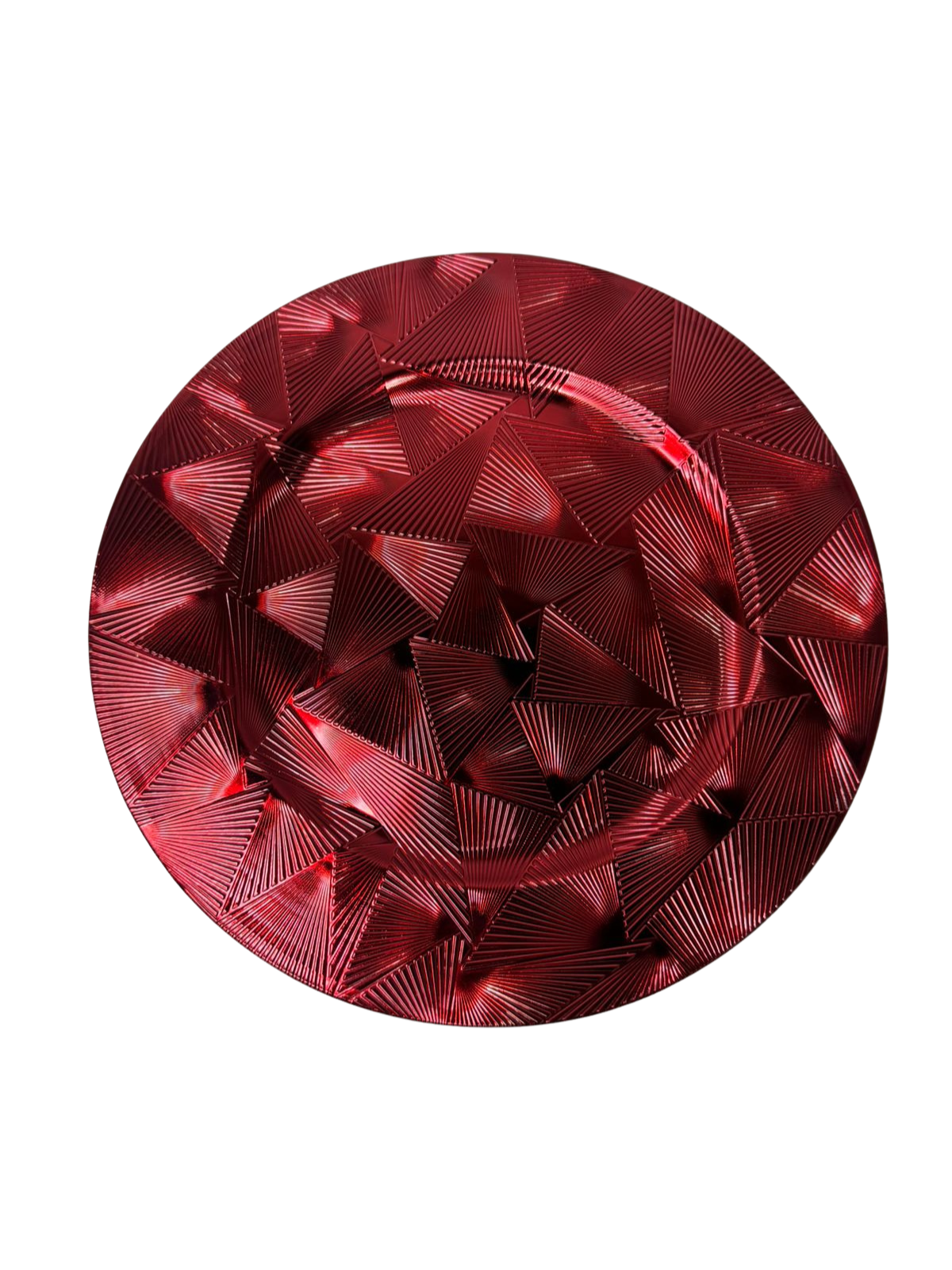 Refina la presentación de tu mesa con este exclusivo plato base de 33×33 cm, diseñado en un elegante acabado rojo. Su borde destaca por un patrón en relieve de triángulos 3D, que aporta textura, brillo y un estilo contemporáneo único.