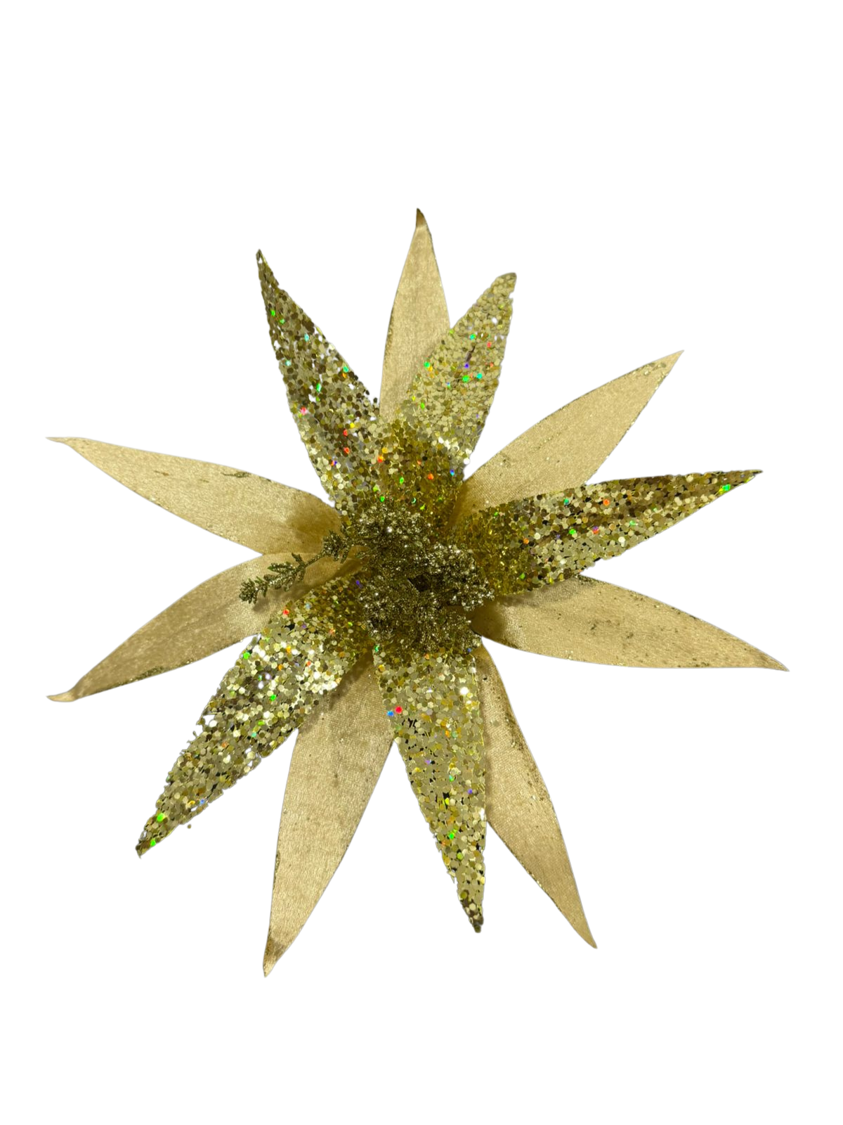 La Poinsettia Grande Hoja Gamuza-Malla Flor Dorado 54×44 cm es una flor decorativa imponente, diseñada para convertirse en la protagonista de cualquier espacio navideño. Elaborada en gamuza de alta calidad combinada con malla decorativa, resalta por su tono dorado brillante que transmite lujo, sofisticación y calidez festiva.