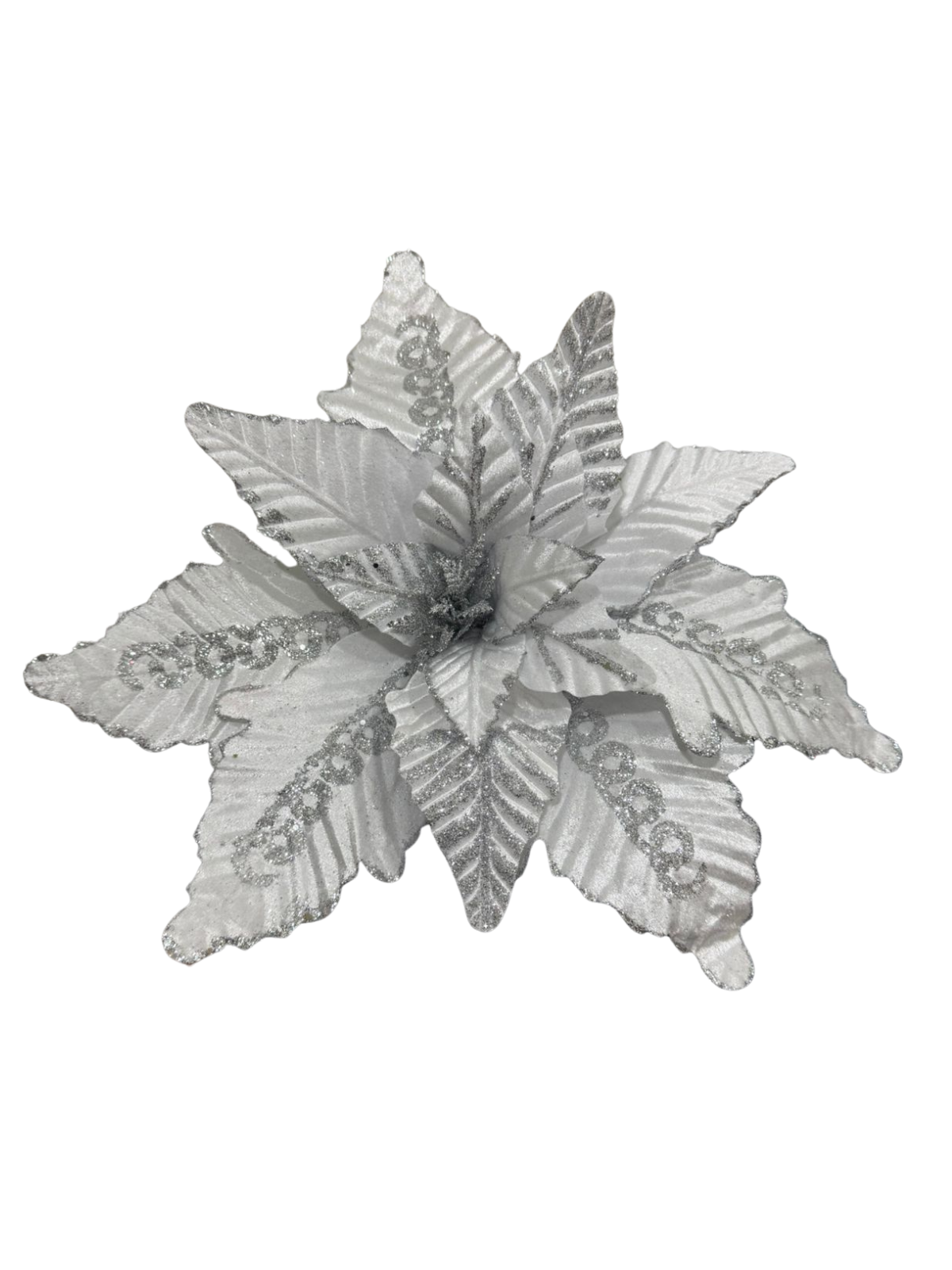 La Poinsettia Líneas Blanca 55×51 cm es una flor decorativa de gran tamaño que combina pureza, elegancia y un diseño sofisticado. Elaborada en gamuza de alta calidad, se distingue por su acabado en blanco radiante y sus delicados pétalos decorados con finas líneas escarchadas que aportan brillo y un efecto luminoso sutil.