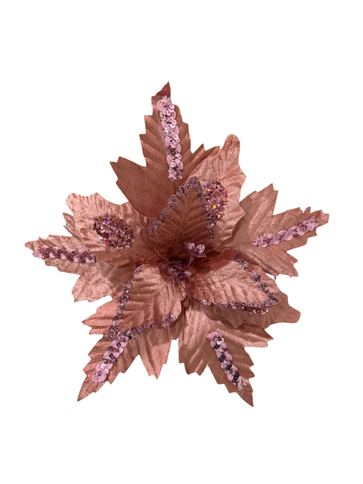 Flor decorativa de gran tamaño que combina la elegancia del oro rosa con el brillo sutil de sus pétalos lobados. Ideal para dar un toque sofisticado y glamuroso a tu árbol, guirnaldas o arreglos, convirtiéndose en el detalle perfecto para una Navidad llena de estilo y distinción.