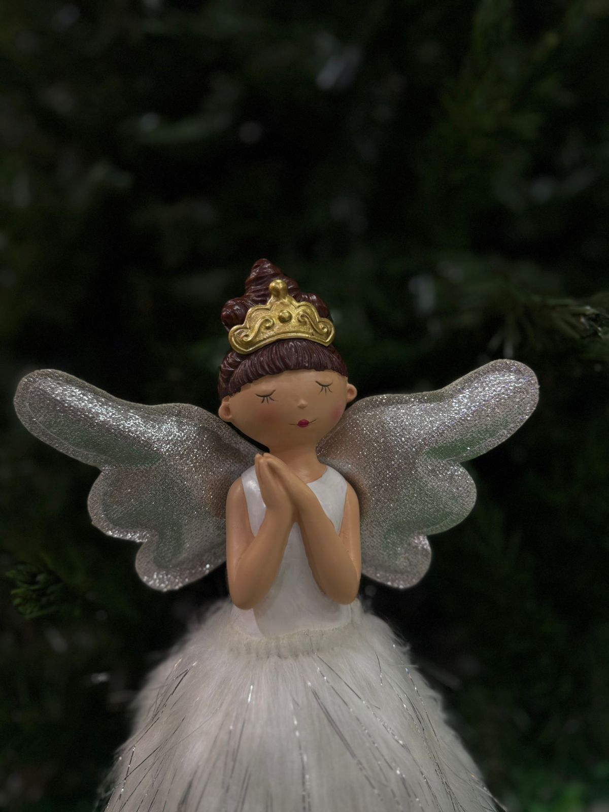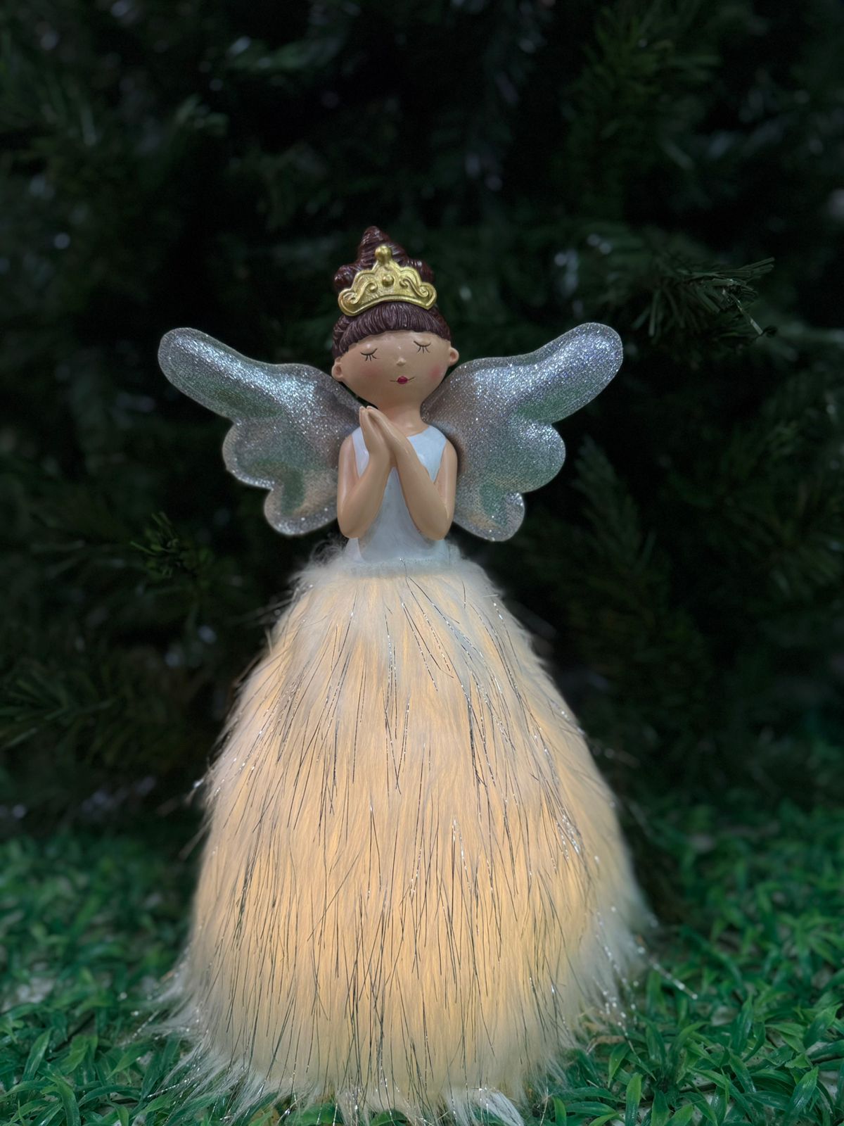 Aporta un toque mágico y encantador a tu decoración navideña con la delicada figura Reina Hada Florecitas Cabello Alas Café. Esta pieza, de 22×22×36 cm, destaca por su diseño dulce y elegante: su vestido de suave pelaje blanco con luces integradas ilumina sutilmente el ambiente, mientras que sus alas con destellos plateados y su peinado adornado con una corona evocan la fantasía y la ternura de los cuentos de hadas. Ideal para colocar en el árbol, mesas decorativas o rincones especiales, esta hada es perfecta para dar calidez, luz y un aire de ensueño a tu hogar durante la temporada navideña.