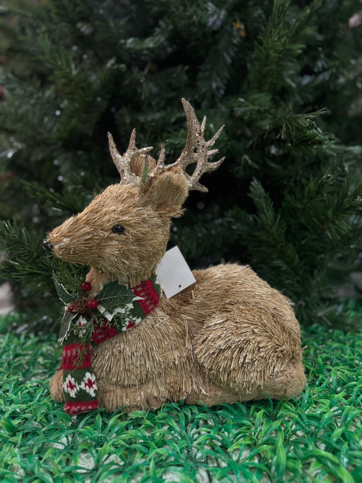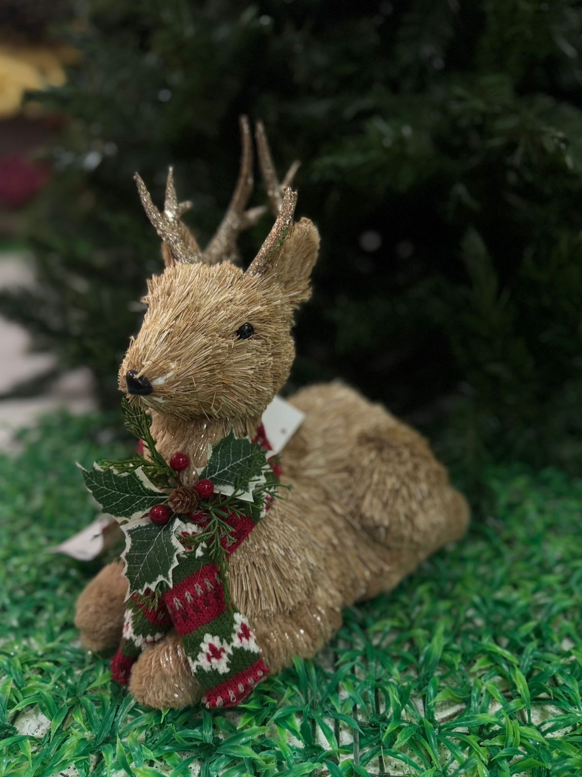 Encantador reno decorativo acostado, elaborado con materiales que imitan fibras naturales, con finos acabados que aportan un estilo rústico y acogedor. Adornado con una bufanda en tonos festivos y detalles clásicos como hojas de acebo, piñas y bayas. Con una longitud de 37 cm, es ideal para complementar tu decoración navideña, añadiendo un toque natural y encantador a cualquier espacio.