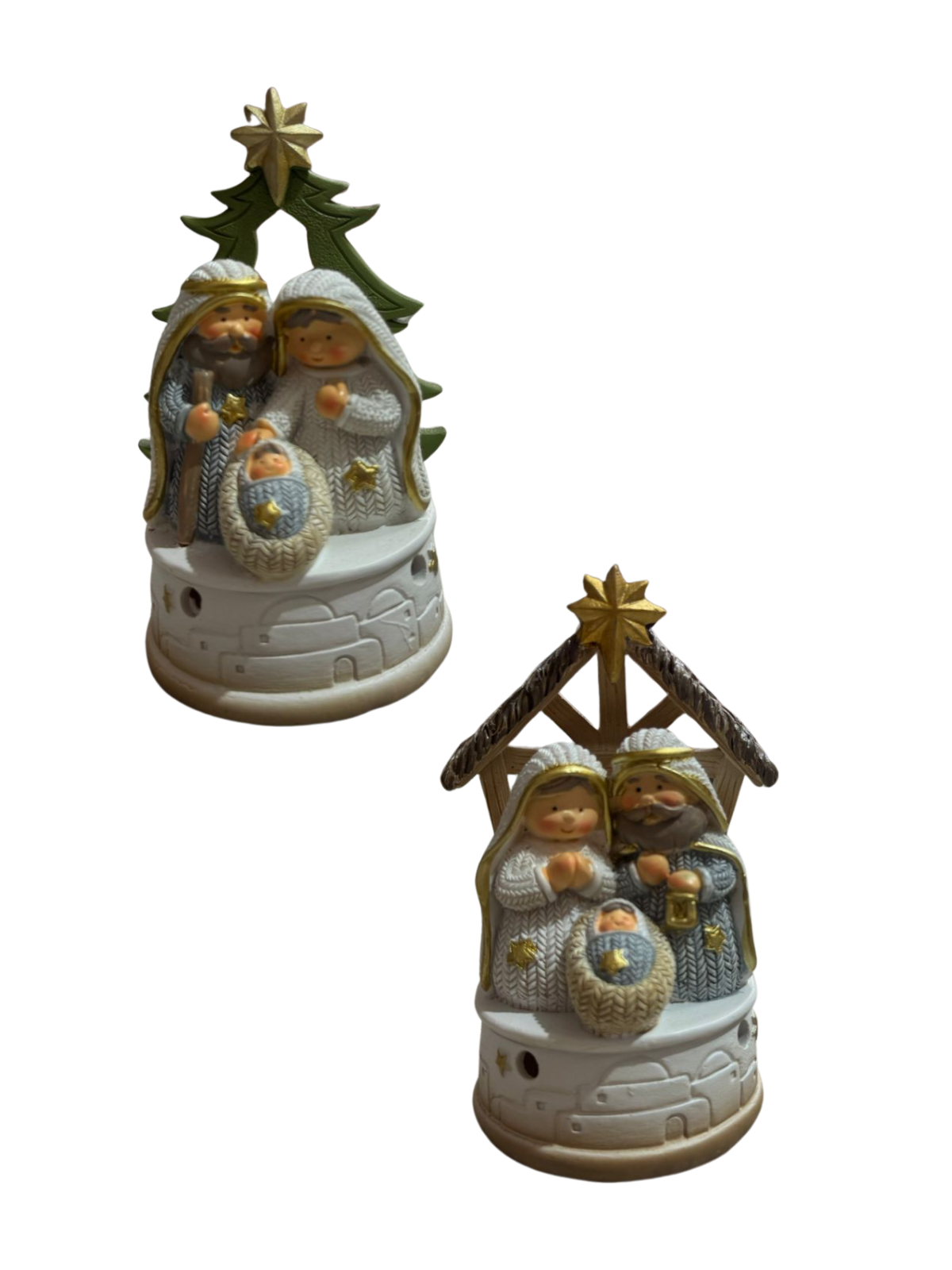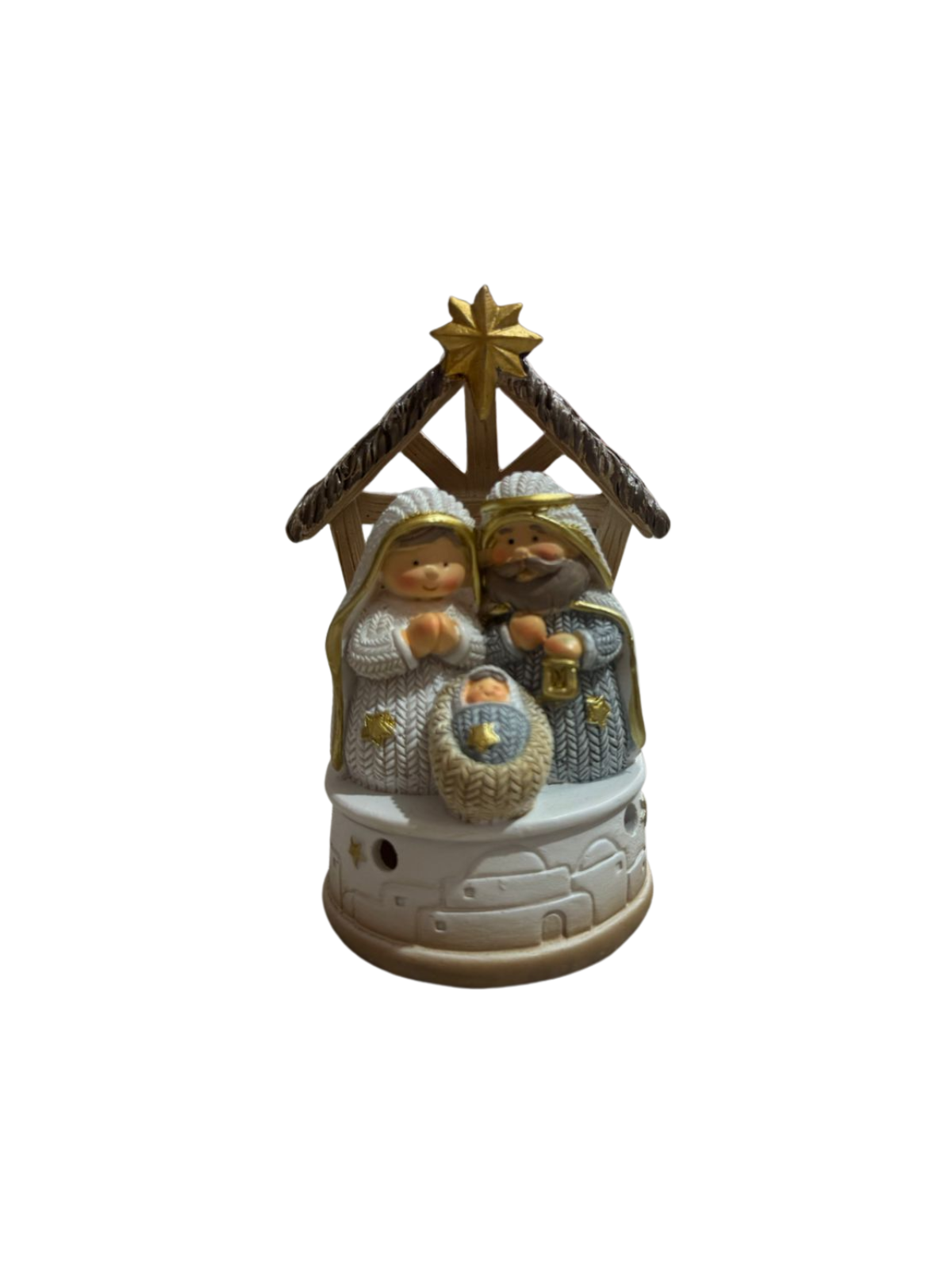 Elegante Sagrada Familia en pedestal con luces, disponible en tonos azul y blanco, elaborada en poliresina de alta calidad. Esta hermosa pieza representa a la Virgen María, San José y el Niño Jesús con un diseño delicado y moderno que transmite serenidad, pureza y espiritualidad.