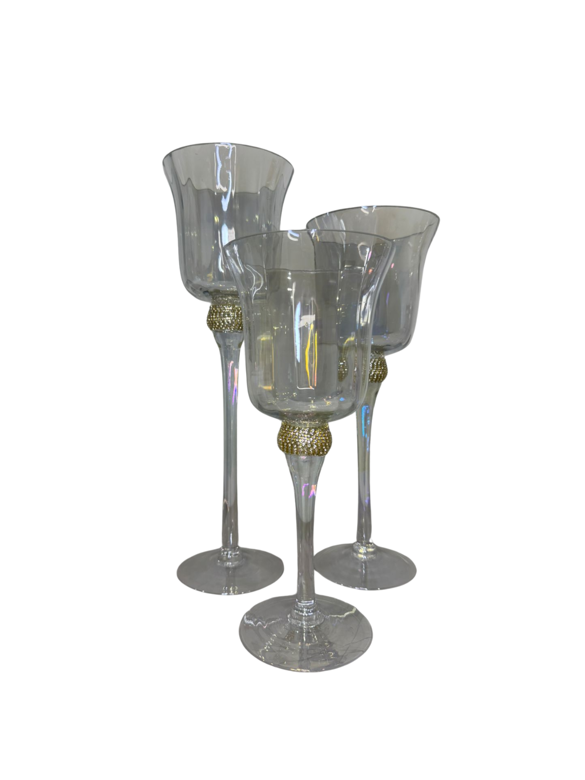 Set de 3 copas decorativas en vidrio transparente con elegante pomo dorado texturizado. Perfectas para centros de mesa, decoración de eventos o para aportar un toque de distinción y brillo a cualquier espacio.