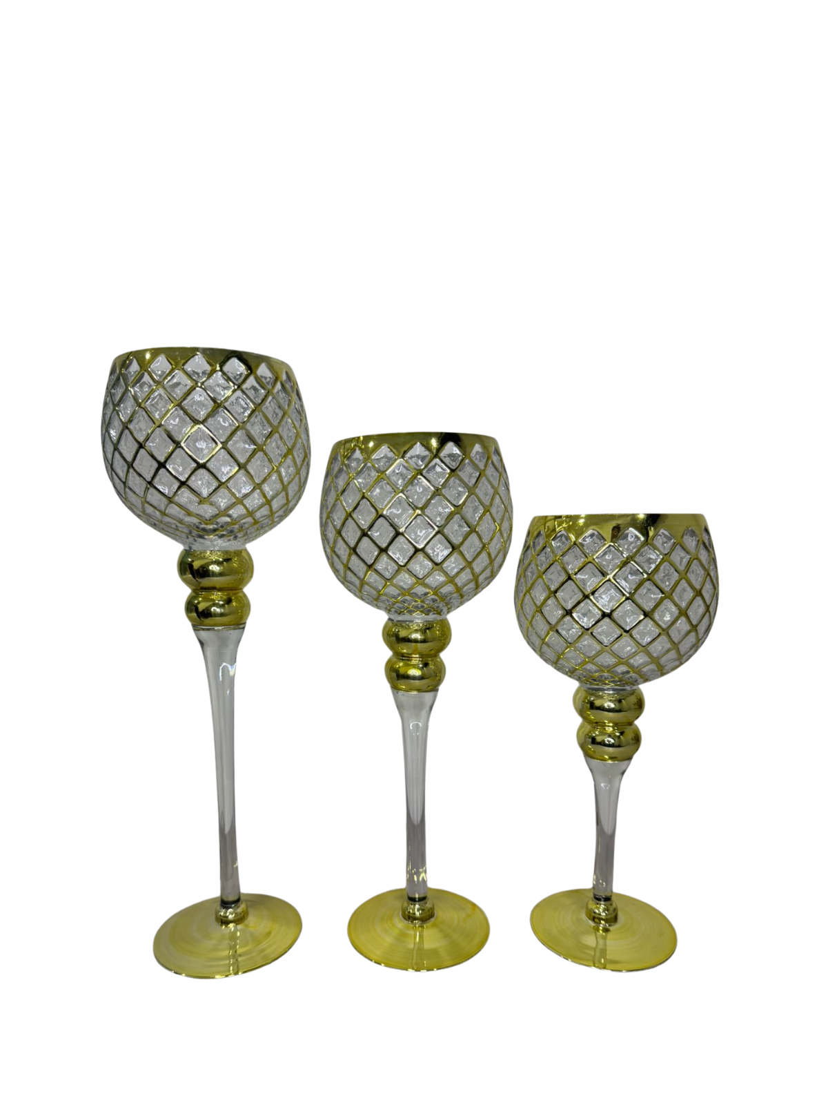 Set de 3 copas decorativas con diseño de rombos dorados y vidrio transparente. Elegantes y llamativas, ideales para centros de mesa, decoración de eventos o para aportar un toque de lujo y brillo a cualquier espacio.