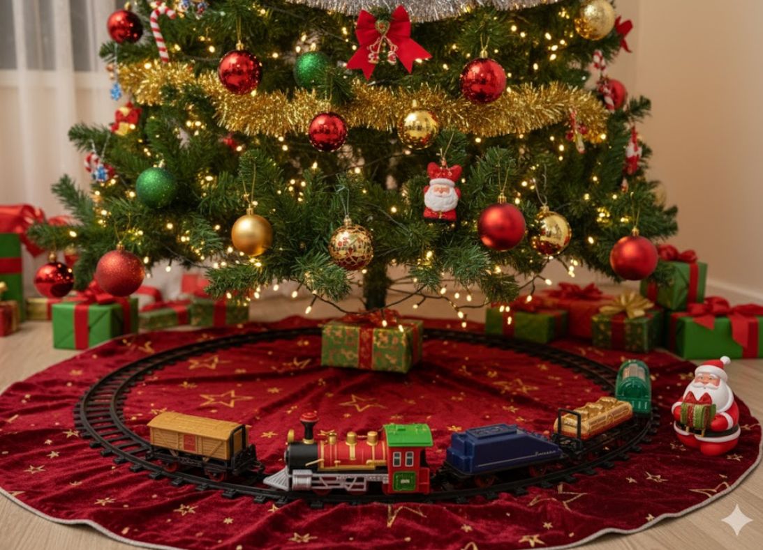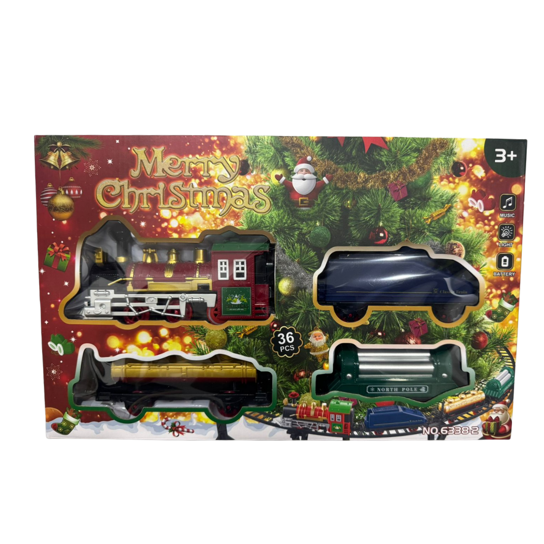 Este tren clásico de Navidad con luz y música es ideal para decorar el árbol y entretener a los más pequeños. Incluye 36 piezas, entre ellas una locomotora, vagones y vías elevadas para formar un circuito circular. Funciona con baterías y es apto para niños mayores de 3 años.