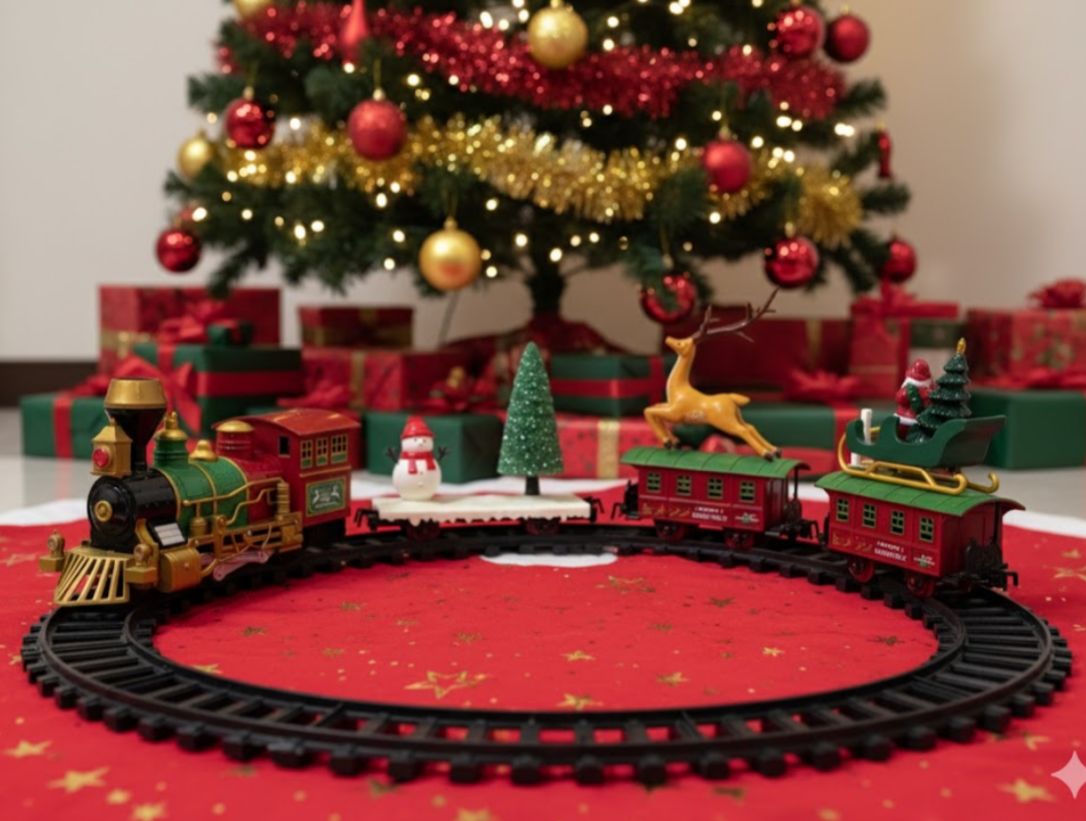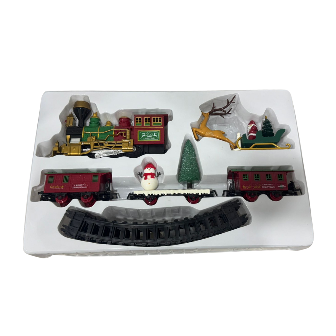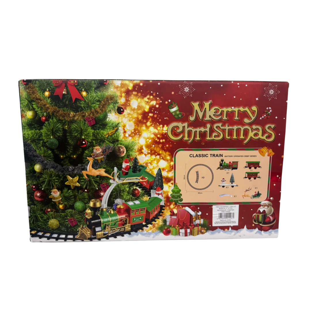 Este tren clásico de Navidad con luz y música es ideal para decorar el árbol y entretener a los más pequeños. Incluye 14 piezas, entre ellas una locomotora, vagones, terinio con papa noel, y un muñeco de nieve con un árbol de naviada y vías elevadas para formar un circuito circular. Funciona con baterías y es apto para niños mayores de 3 años.