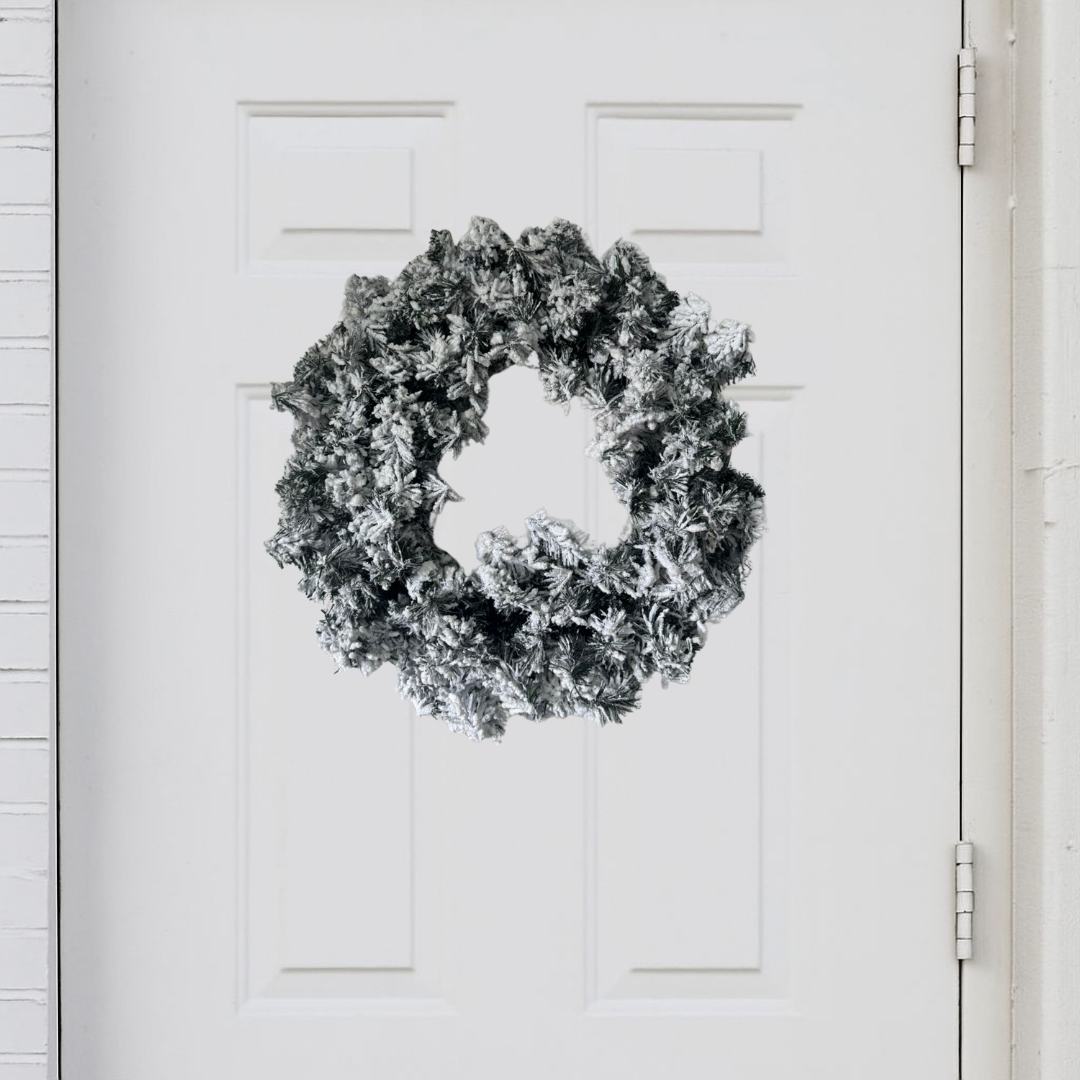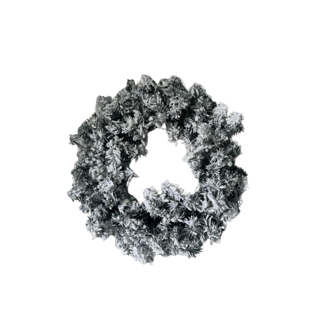 Corona navideña de 45 cm de diámetro con acabado flockizado que simula nieve, aportando un aspecto invernal y elegante. Su follaje denso en tonos verdes y blancos crea una base perfecta para decorar con luces o adornos. Ideal para puertas, paredes o mesas, brindando un toque fresco y festivo al ambiente.
